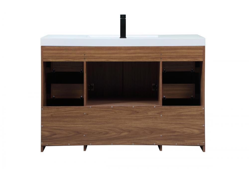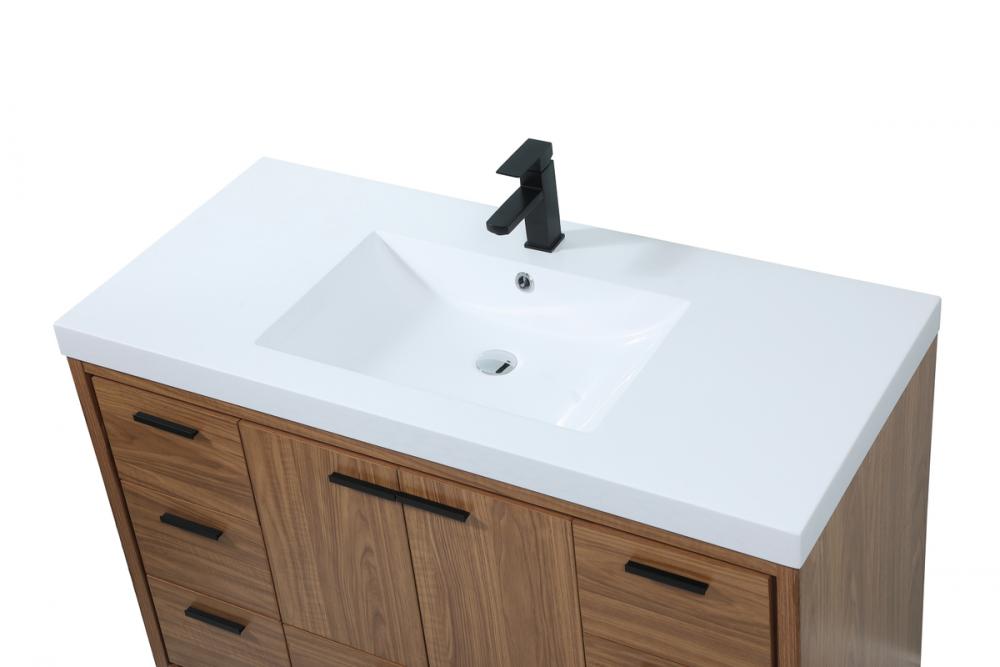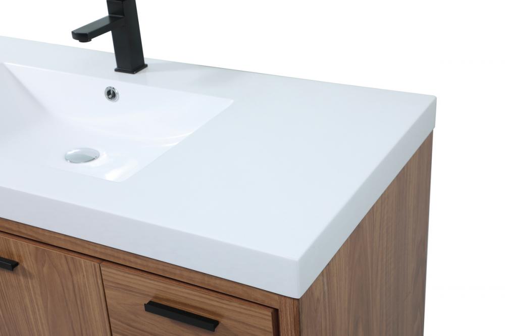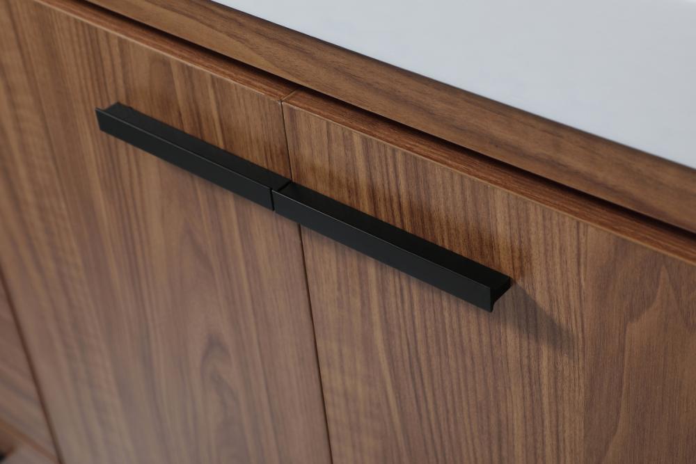 Modern sophistication is defined within the wood finish look and black barpulls of this vanity. Its length makes it the perfect addition to any sized home, and saves space with its storage area hidden behind the double cabinet doors and one bottom drawers. Topped with a highly durable thick resin white counter top and an integrated sink, this modern design will add everlasting class to your bathroom and powder room.