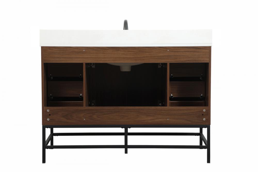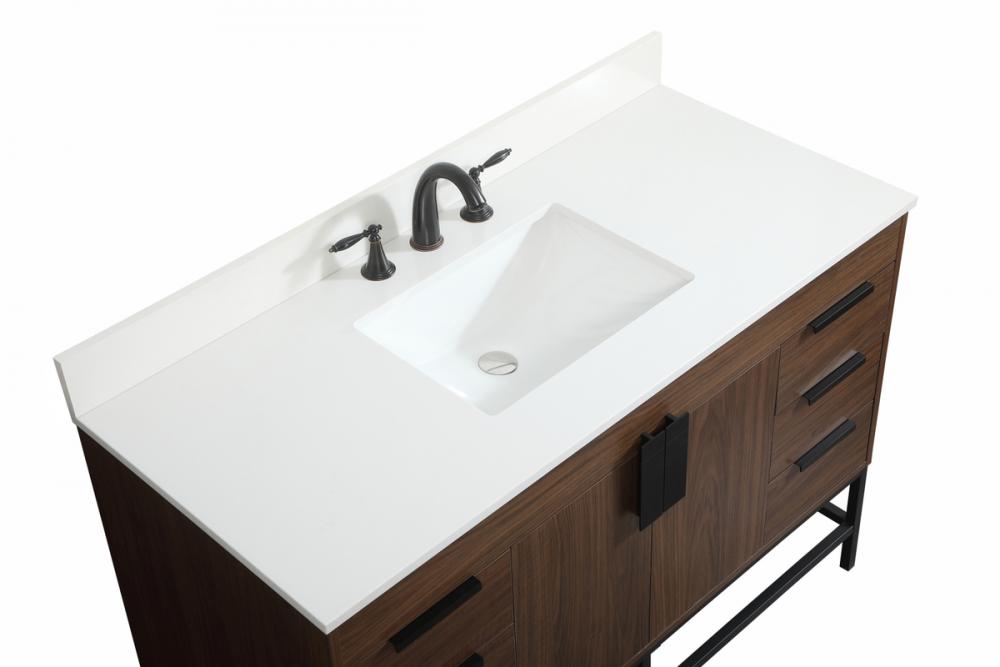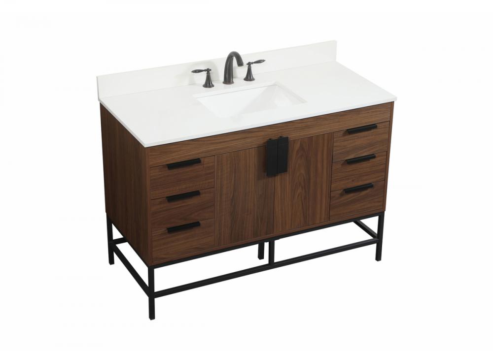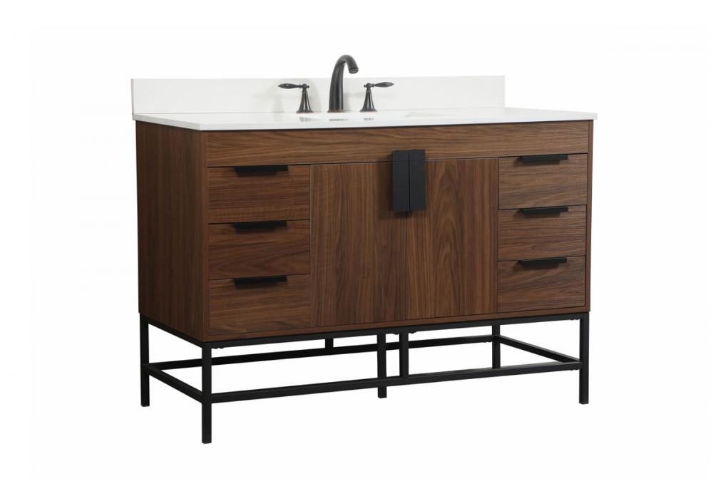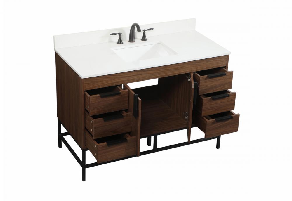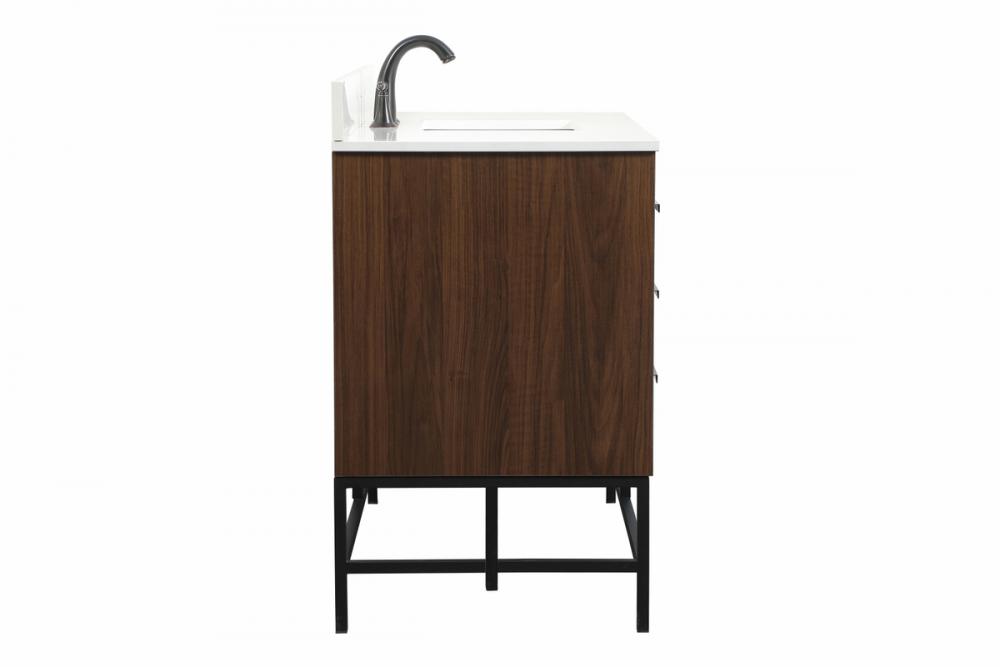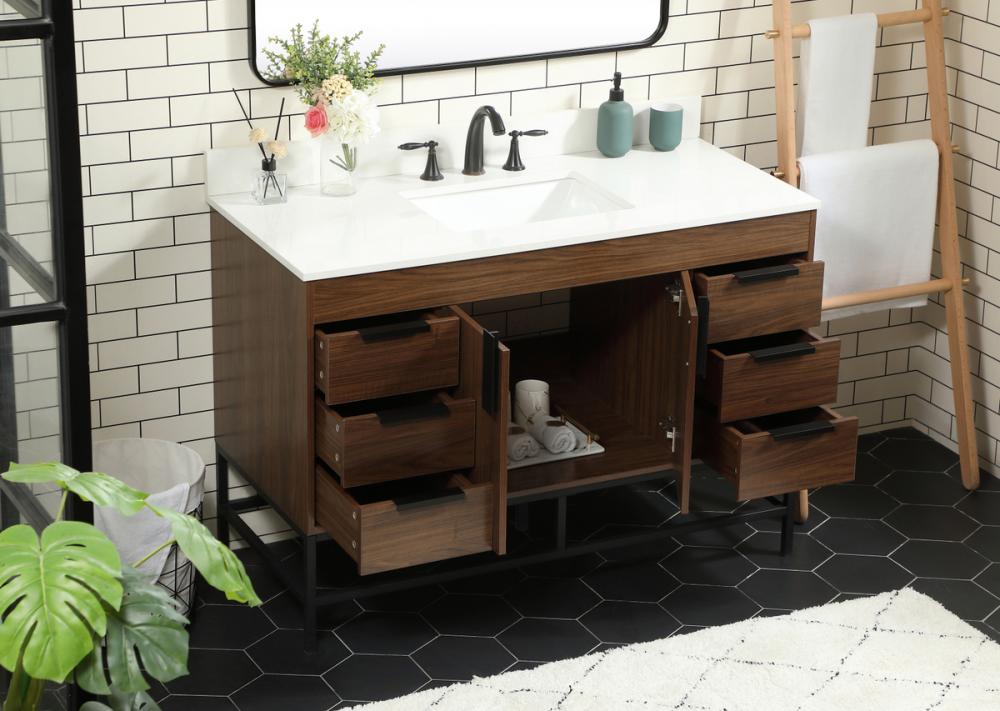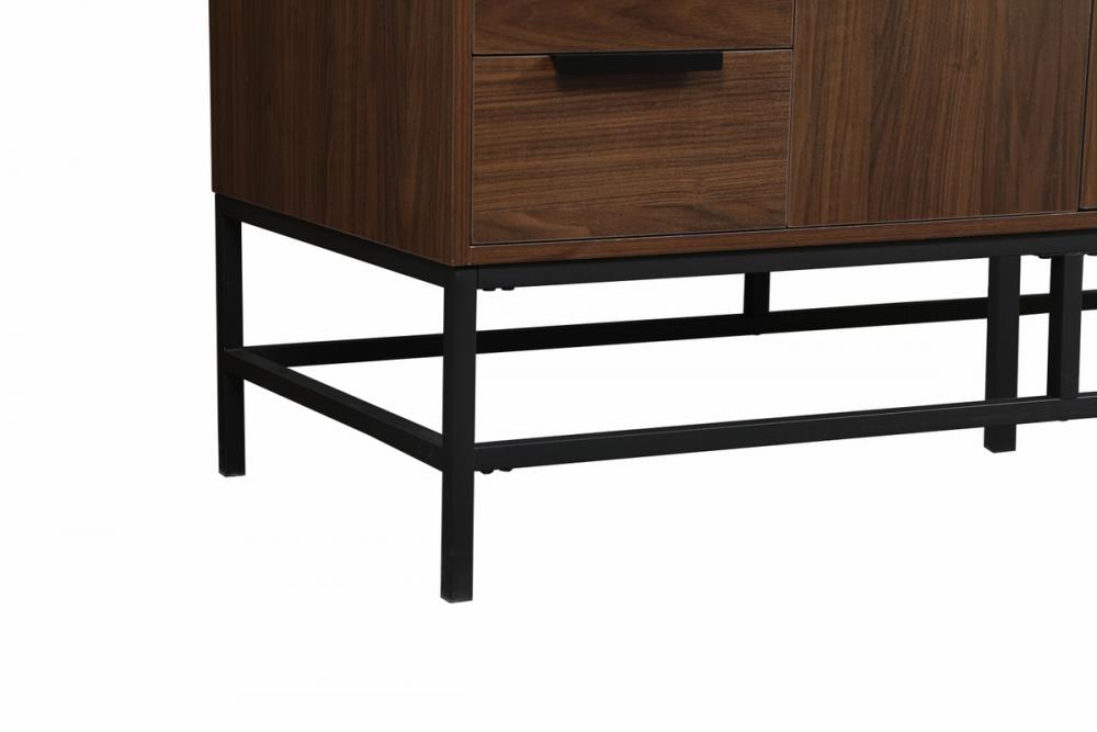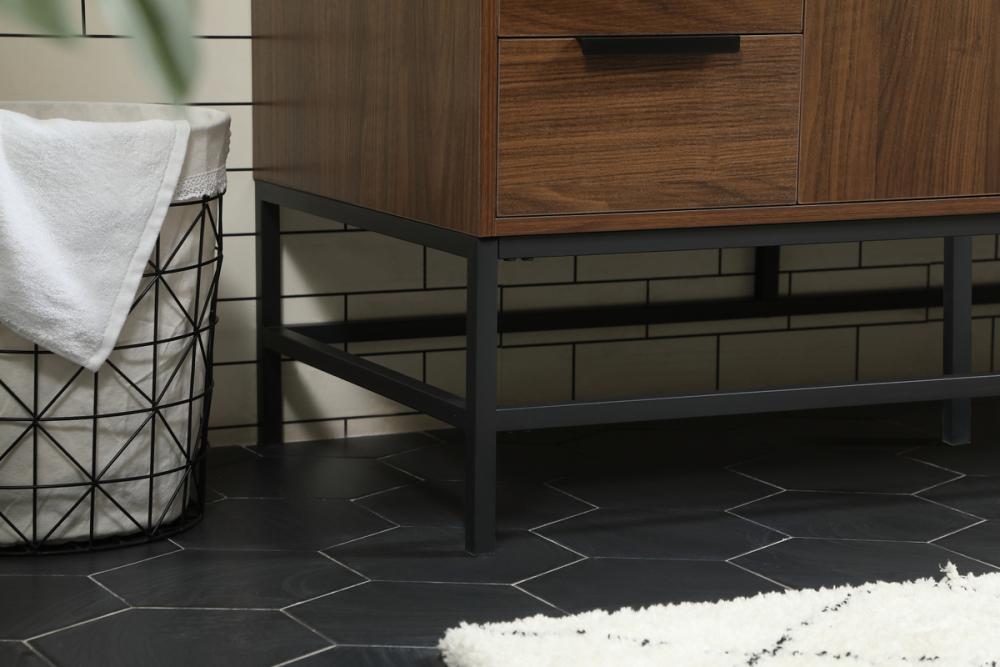 This vanity is a sleek-looking piece of bathroom furniture that is easy to incorporate into your design scheme. The cabinet features a smooth door panel with an oversized steel handle and soft close hinges provide ample room for accessories. Packed with multiple side drawers with soft close glides for added comfort and full access to bath supplies. Constructed of engineered wood, the powder-coated metal rod legs are an urban industrial look that we love. Minor assembly of the metal legs needed to get this vanity up and running. Comes with a matching backsplash to complete the look and protects your wall. Comes with a matching backsplash to complete the look and protects your wall.