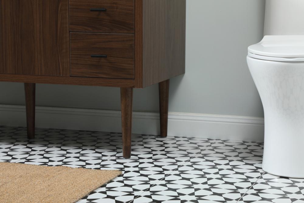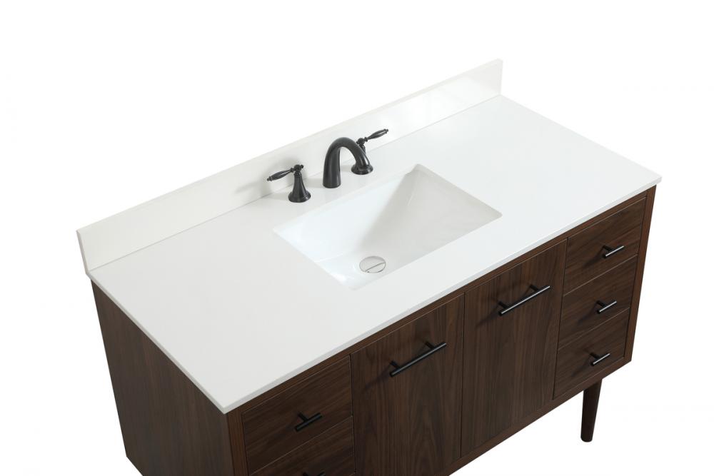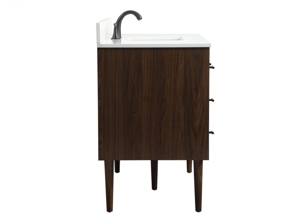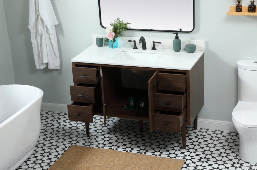 Delve into a world of minimalistic fashion and contemporary styling with this midcentury modern vanity. The clean lines anchors the design, while the straight tapered cylinder legs add subtle interest. Bar pull handle adorns the soft closing door hiding the base of the rectangular porcelain sink and letting you store your bathroom necessities and toiletries. Six soft closing drawers add plenty of storage option. Whether you want to use this as a floating vanity or a freestanding vanity, the choice is yours. The durable ivory white engineered marble countertop complements the manufactured wood base vanity and is built to last. Comes with a matching backsplash to complete the look and protects your wall.