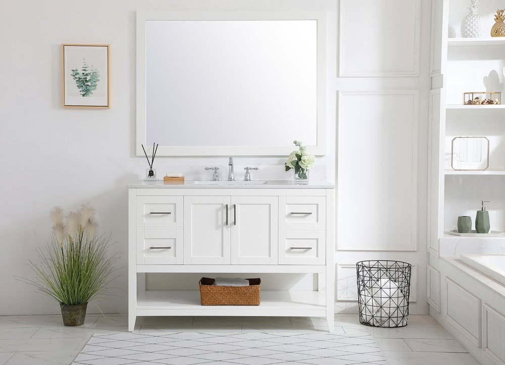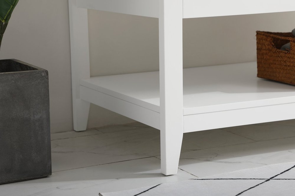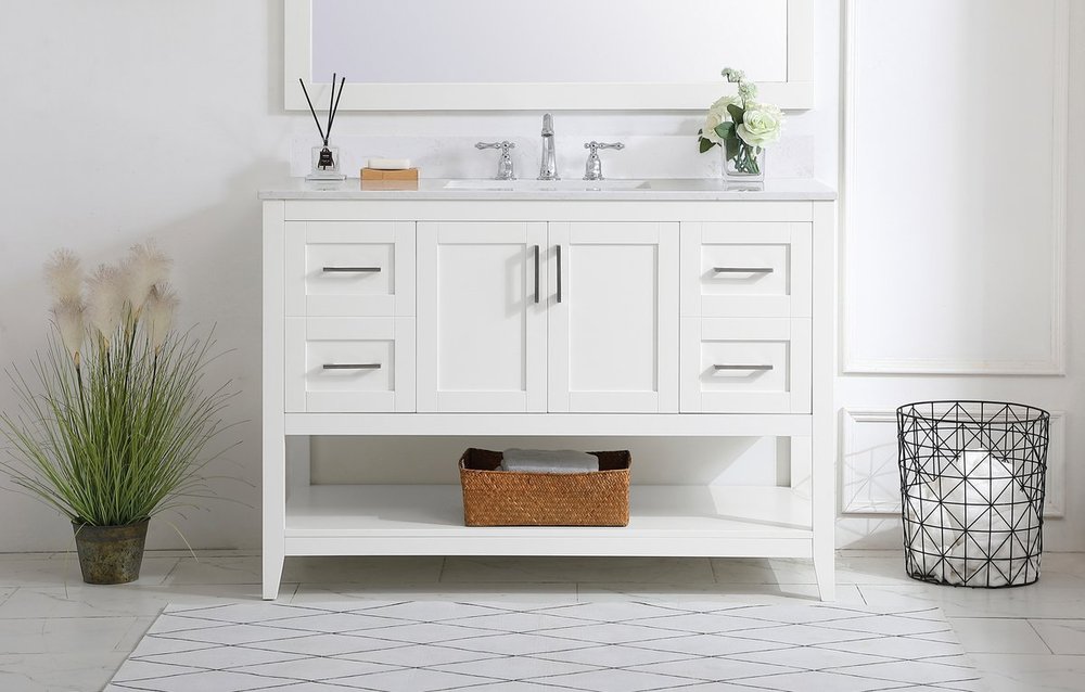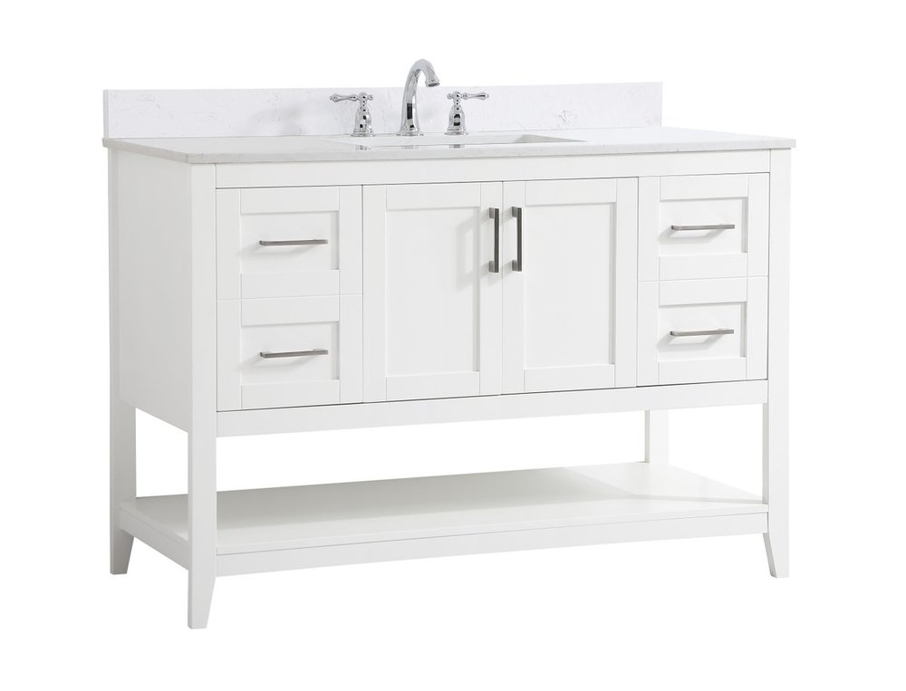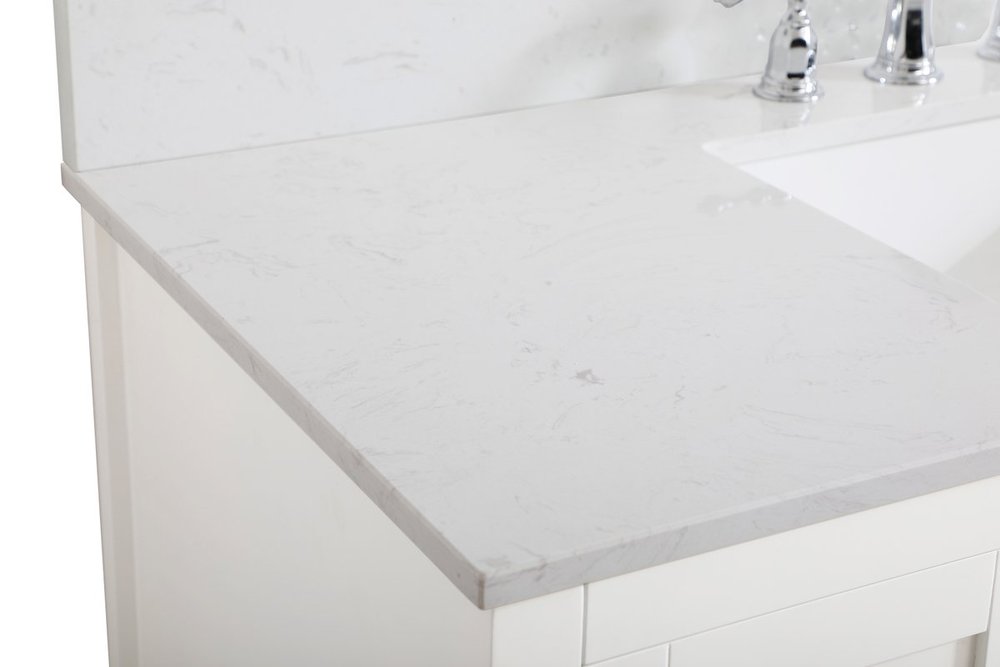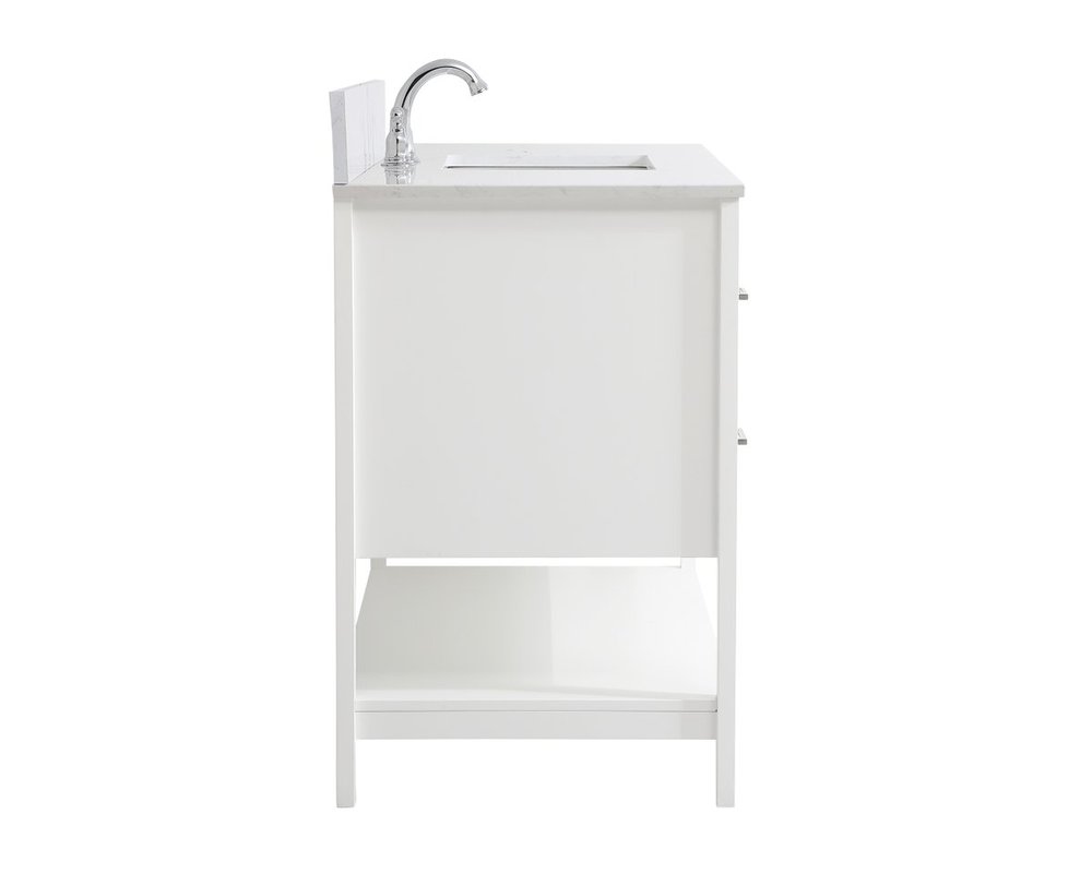 The nonchalant attitude of this 42" traditional white finish vanity will have you wanting more. The slender brushed nickel handle bars open the center double cabinet and two side cabinet doors to reveal ample storage space to put away and store bathroom essentials, and the open space below allows for you to place clean towels on the rack. Topped with a Calacatta engineered marble countertop, you and your guests will enjoy this easy going vanity. Comes with a matching backsplash to complete the look and protects your wall.