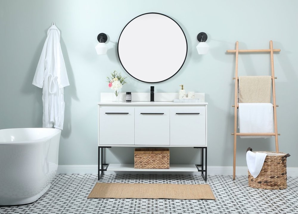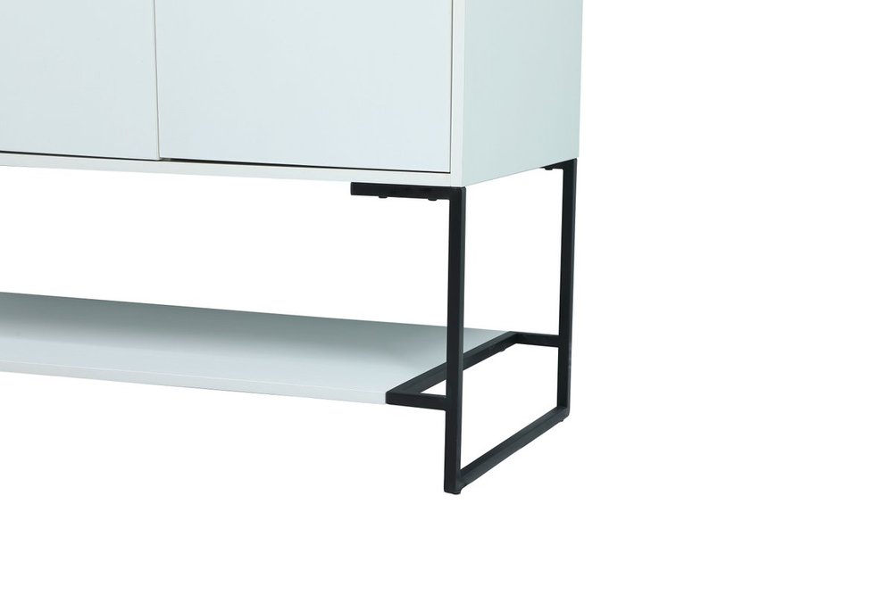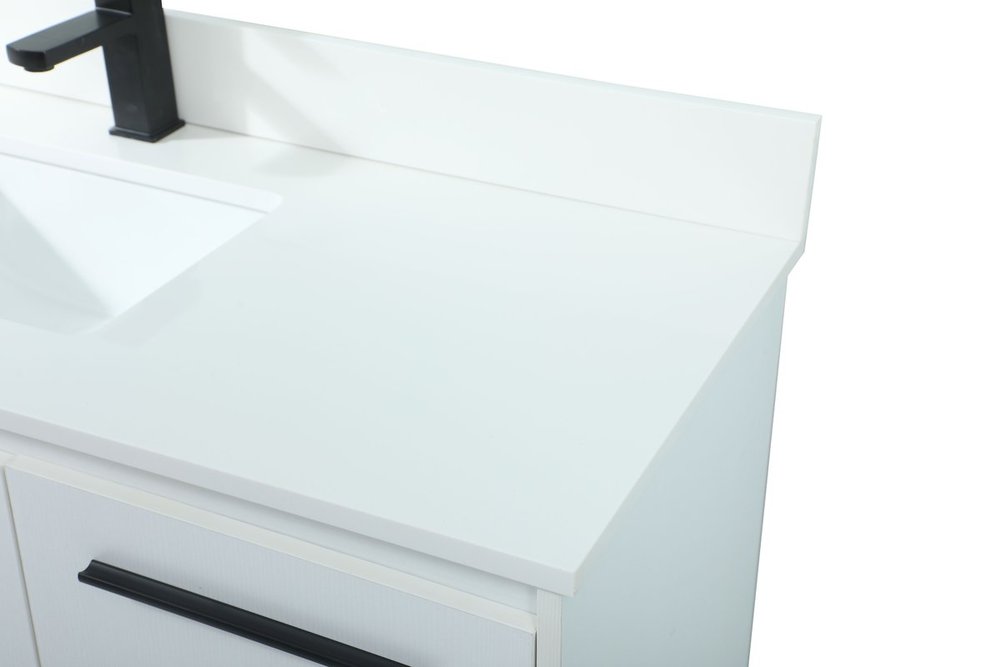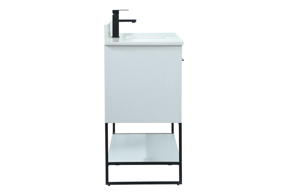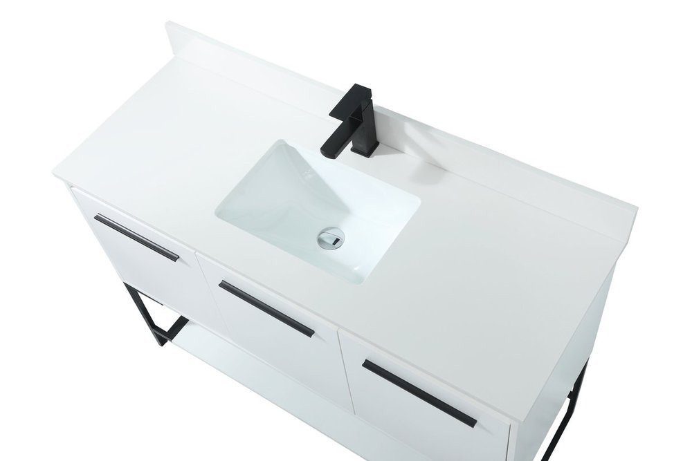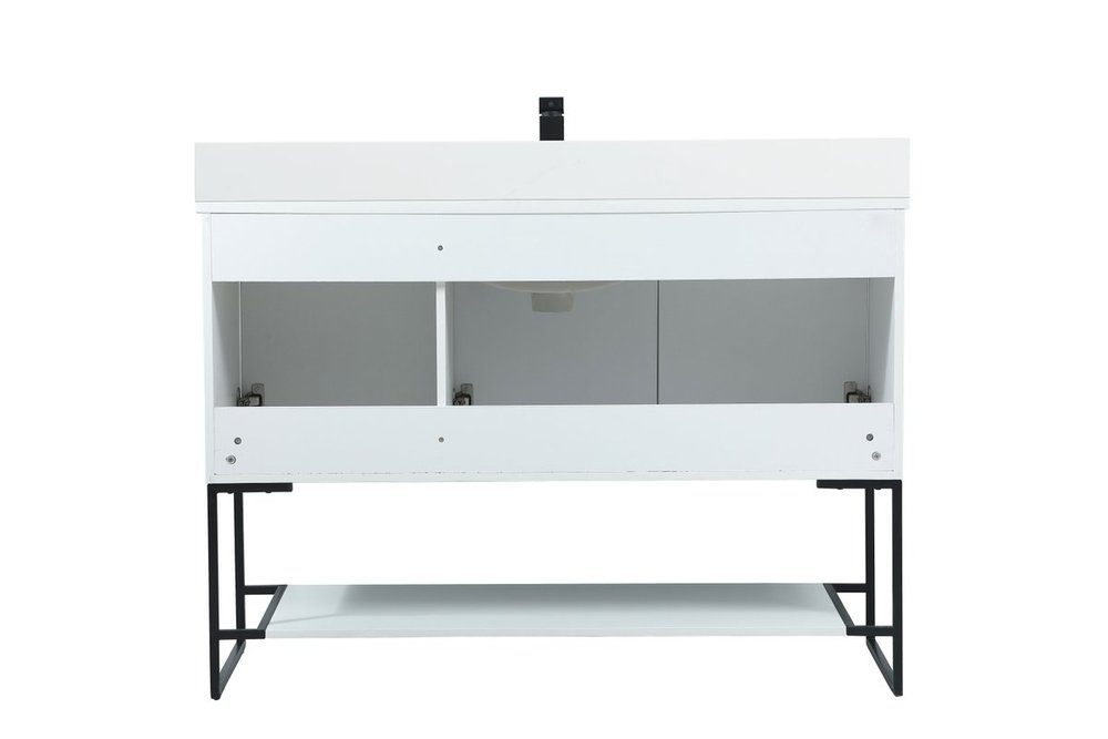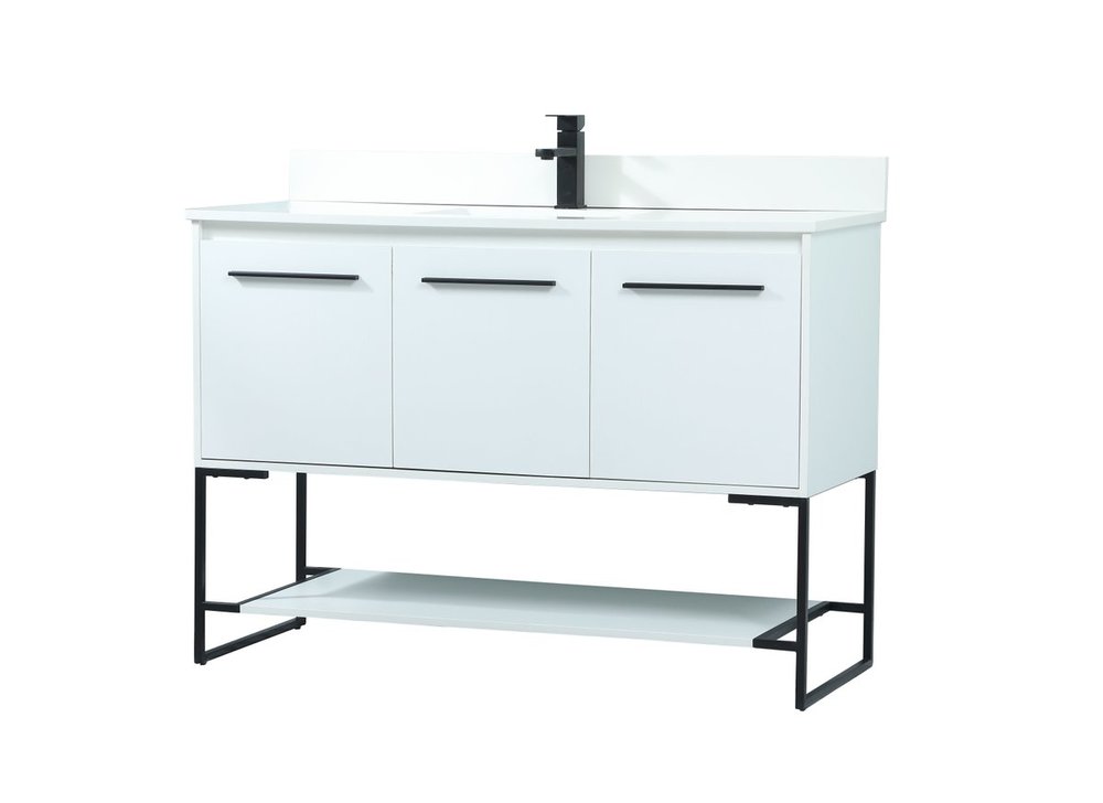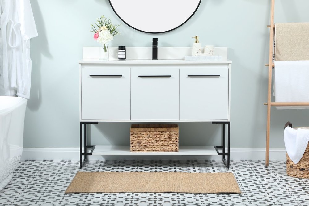 Live in modern comfort with this 48" white finish vanity. Dressed in a white and sleek black metal hardware, its contemporary style will have your bathroom or powder room elevated in industrial sophistication. The open shelf at the base and three doors reveal ample storage space for your bathroom essentials and miscellany. Clean lines create its own visual interest, adding trendy looks to your already chic room. Comes with a matching backsplash to complete the look and protects your wall.