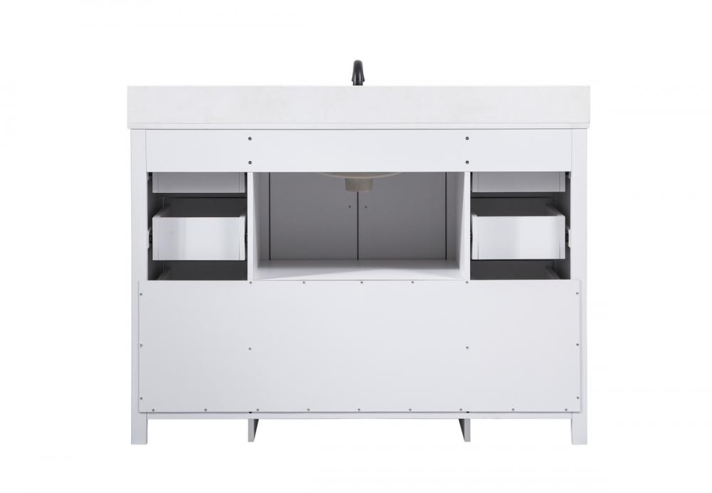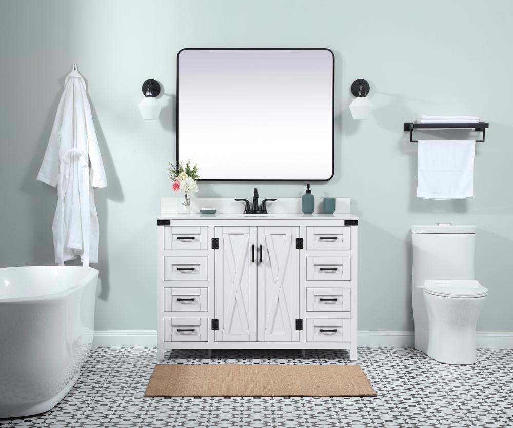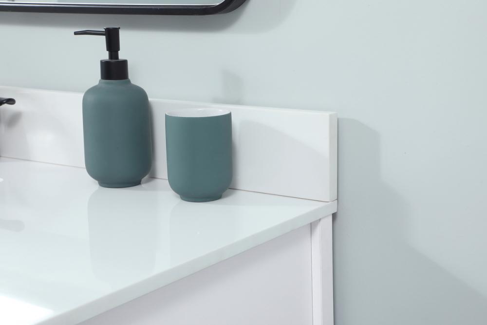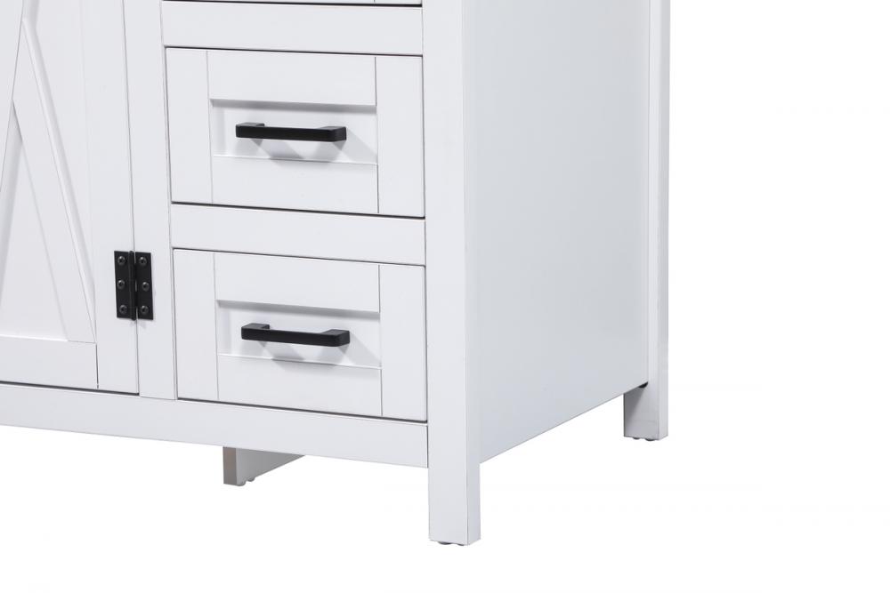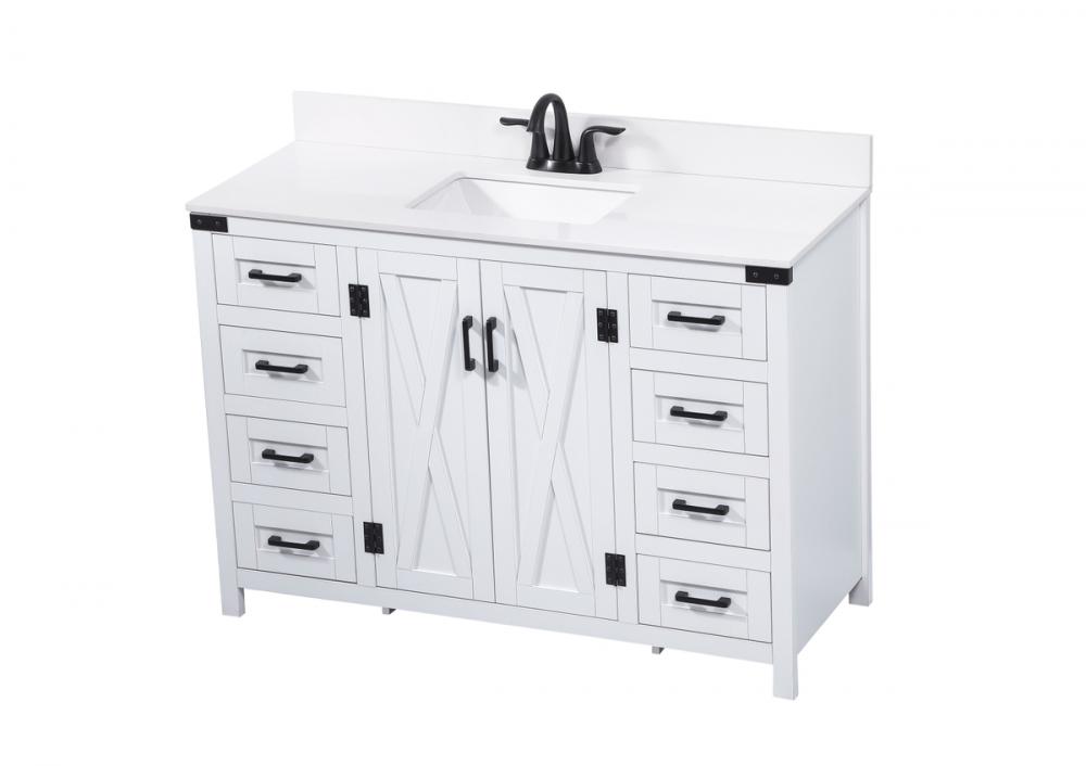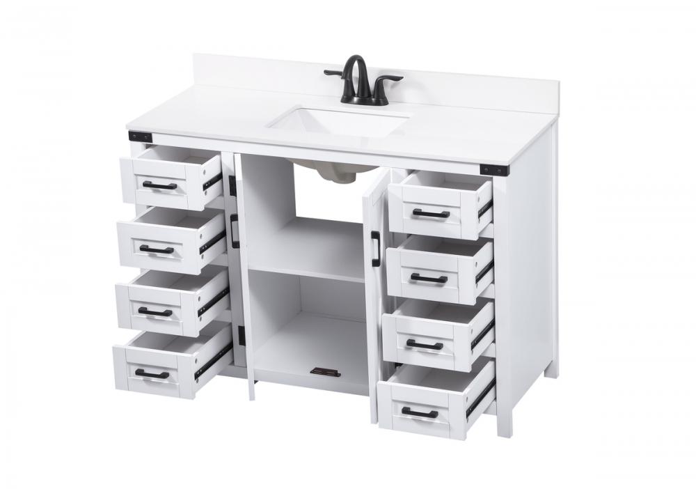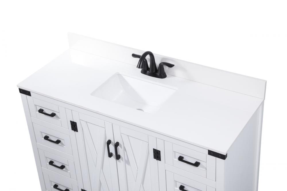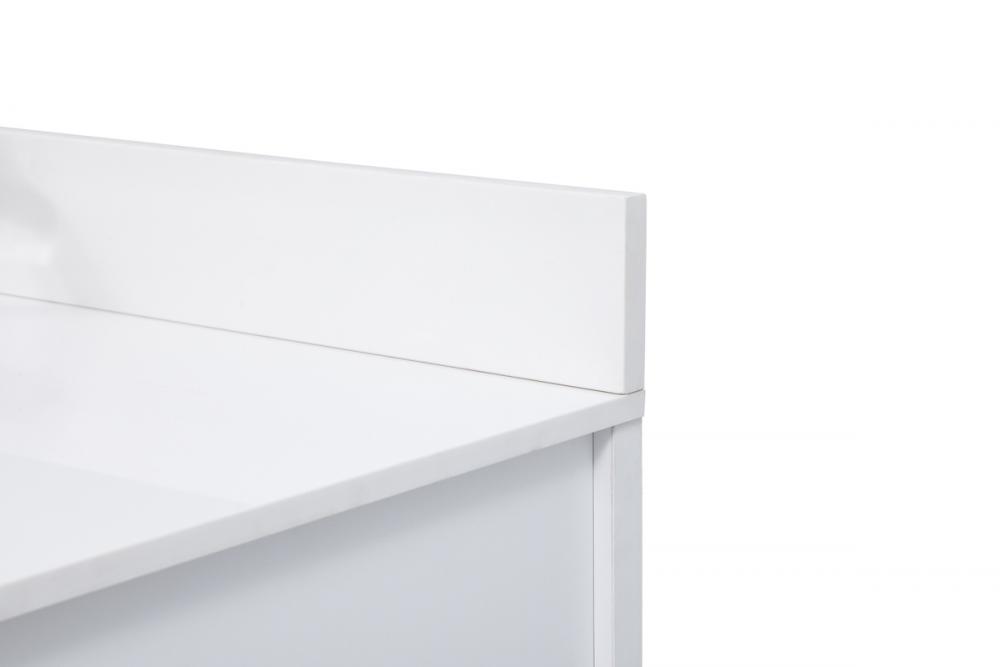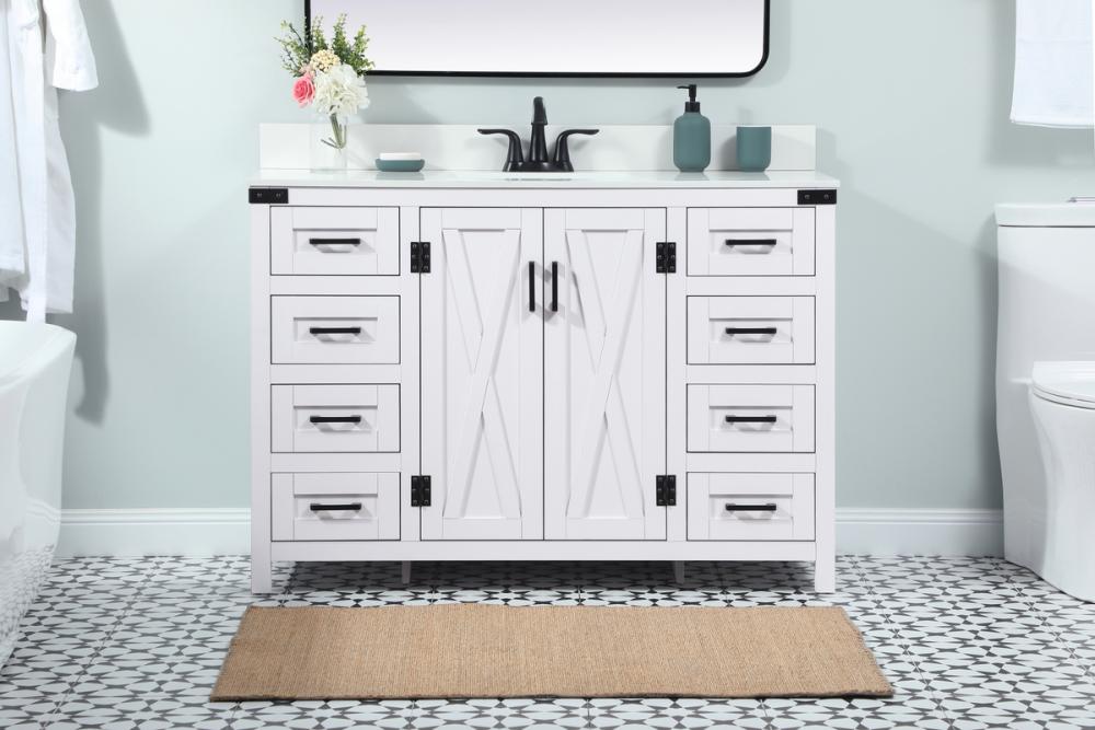 Reminiscent of barn doors, the two door cabinet and eight drawers adds both stylistic charm and function with its plethora of storage options for all your bathroom essentials. Whether for your bathroom or the guests', everyone will marvel at its classic look for traditional and farmhouse aesthetics. A slab of engineered marble rounds out the piece up top, as well as the porcelain under mount sink and predrilled faucet holes. This vanity arrives fully assembled. Comes with a matching backsplash to complete the look and protects your wall.