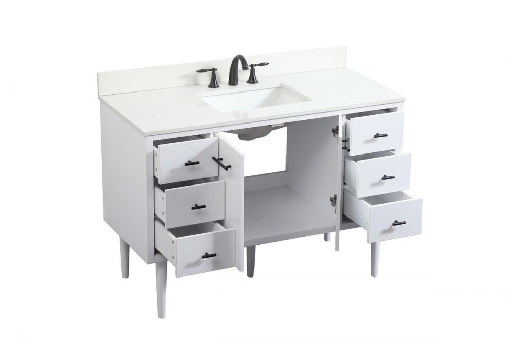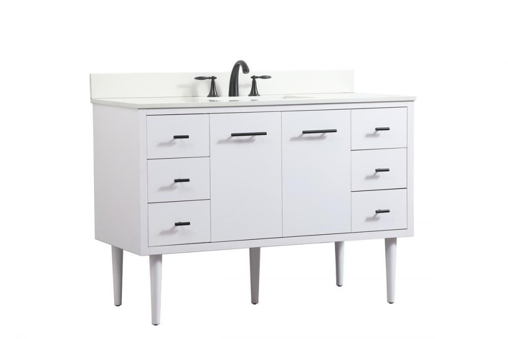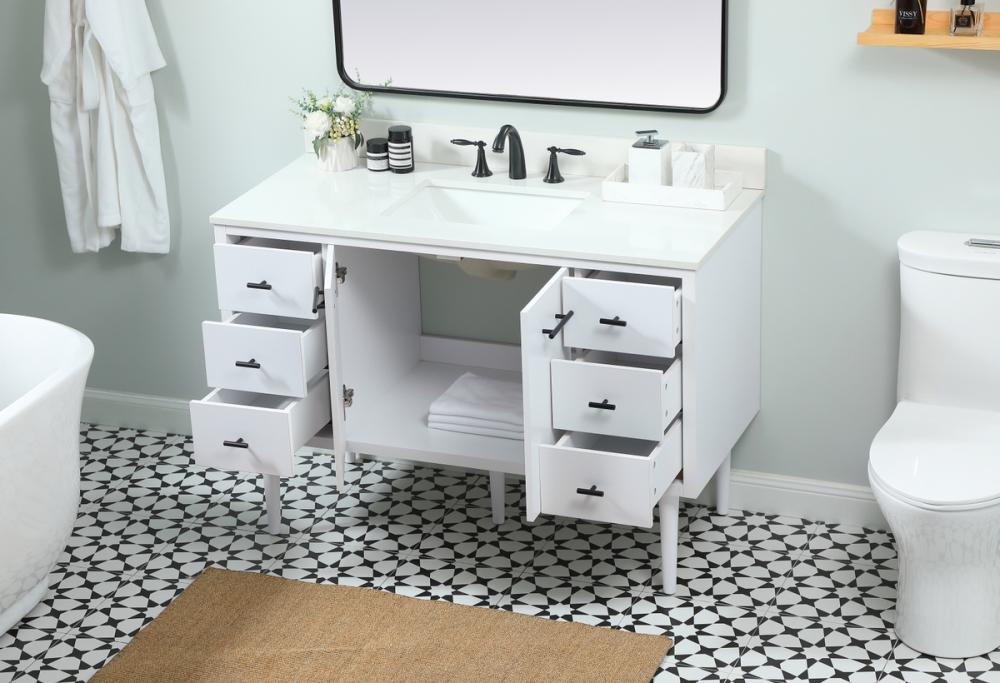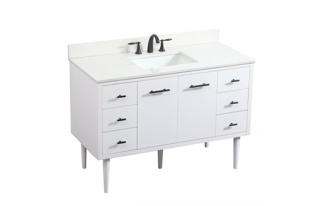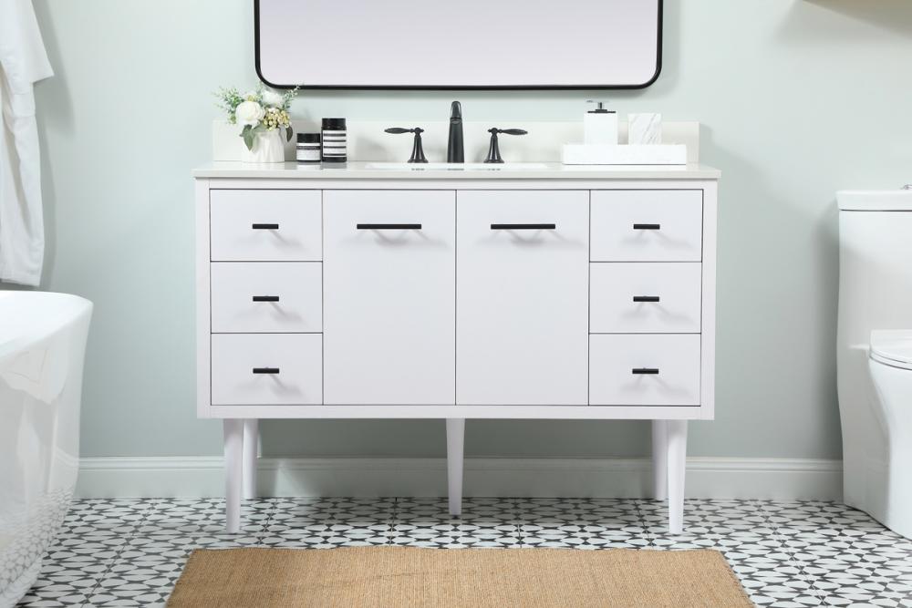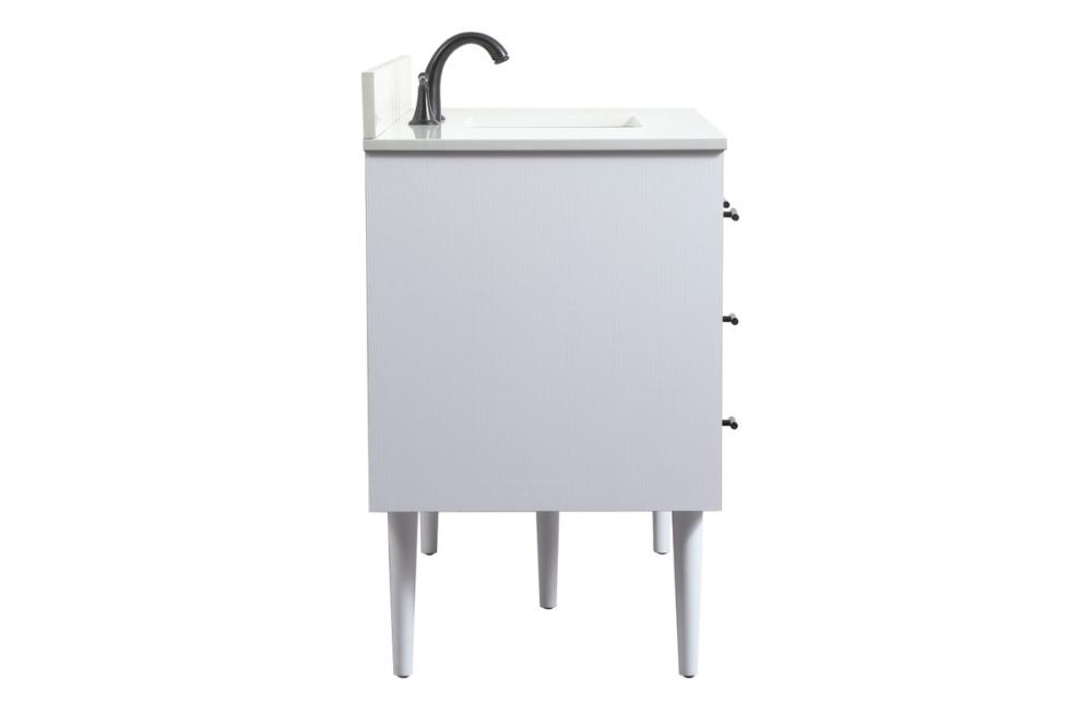 Delve into a world of minimalistic fashion and contemporary styling with this midcentury modern vanity. The clean lines anchors the design, while the straight tapered cylinder legs add subtle interest. Bar pull handle adorns the soft closing door hiding the base of the rectangular porcelain sink and letting you store your bathroom necessities and toiletries. Six soft closing drawers add plenty of storage option. Whether you want to use this as a floating vanity or a freestanding vanity, the choice is yours. The durable ivory white engineered marble countertop complements the manufactured wood base vanity and is built to last. Comes with a matching backsplash to complete the look and protects your wall.