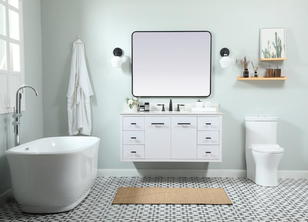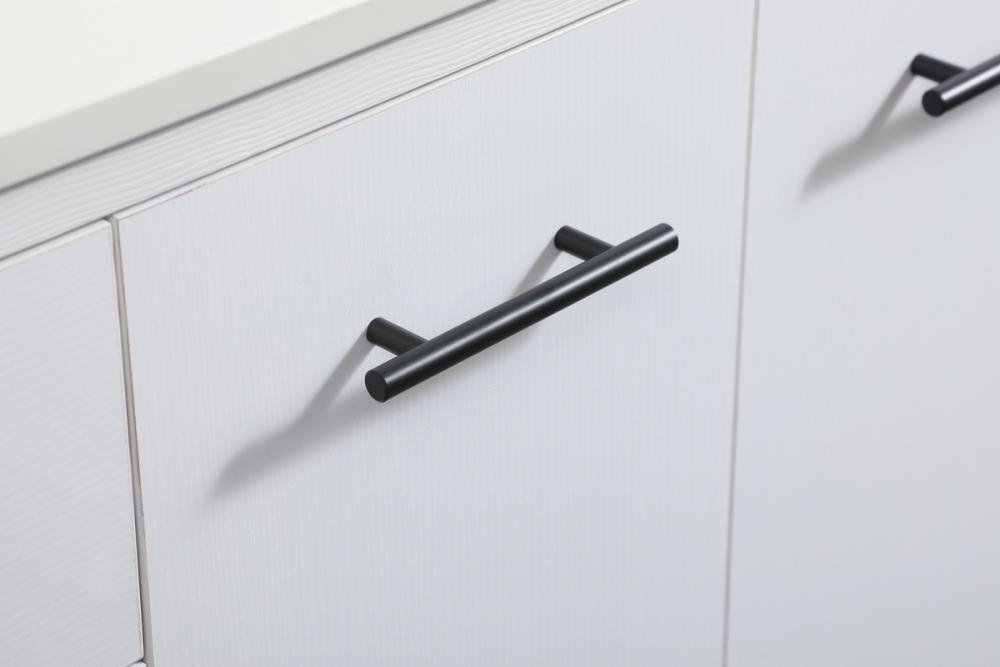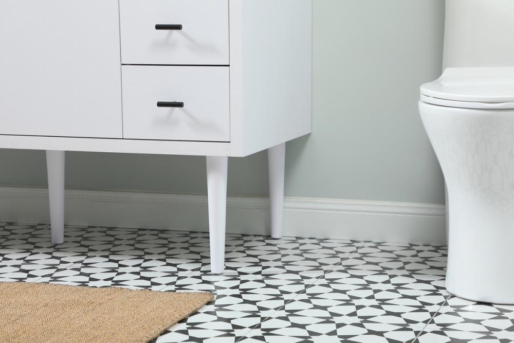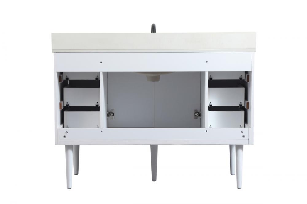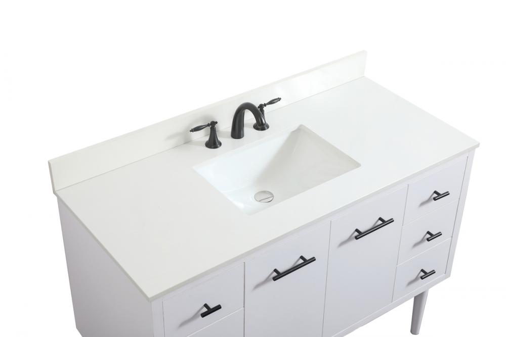 Delve into a world of minimalistic fashion and contemporary styling with this midcentury modern vanity. The clean lines anchors the design, while the straight tapered cylinder legs add subtle interest. Bar pull handle adorns the soft closing door hiding the base of the rectangular porcelain sink and letting you store your bathroom necessities and toiletries. Six soft closing drawers add plenty of storage option. Whether you want to use this as a floating vanity or a freestanding vanity, the choice is yours. The durable ivory white engineered marble countertop complements the manufactured wood base vanity and is built to last. Comes with a matching backsplash to complete the look and protects your wall.