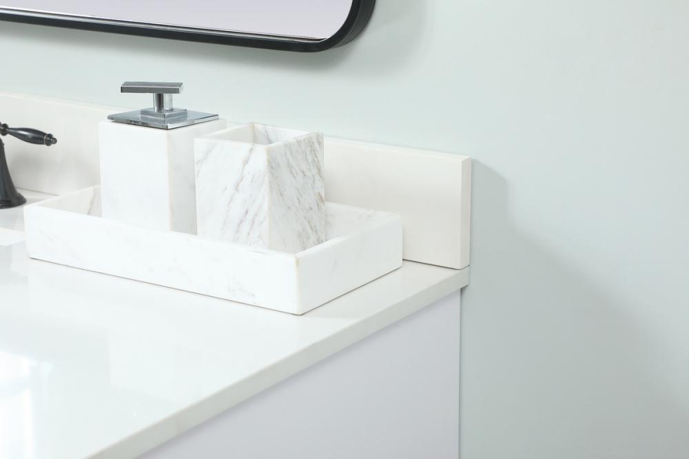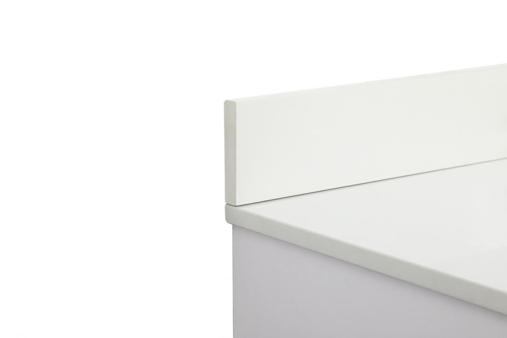 Crafted with durable engineered marble top in ivory white finish and comes with a matching backsplash that measures 48"l x 0.71"w x 3.94"h