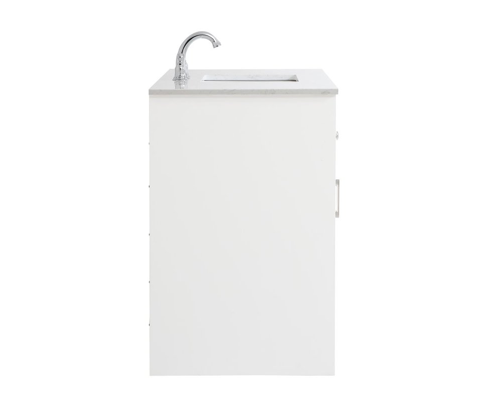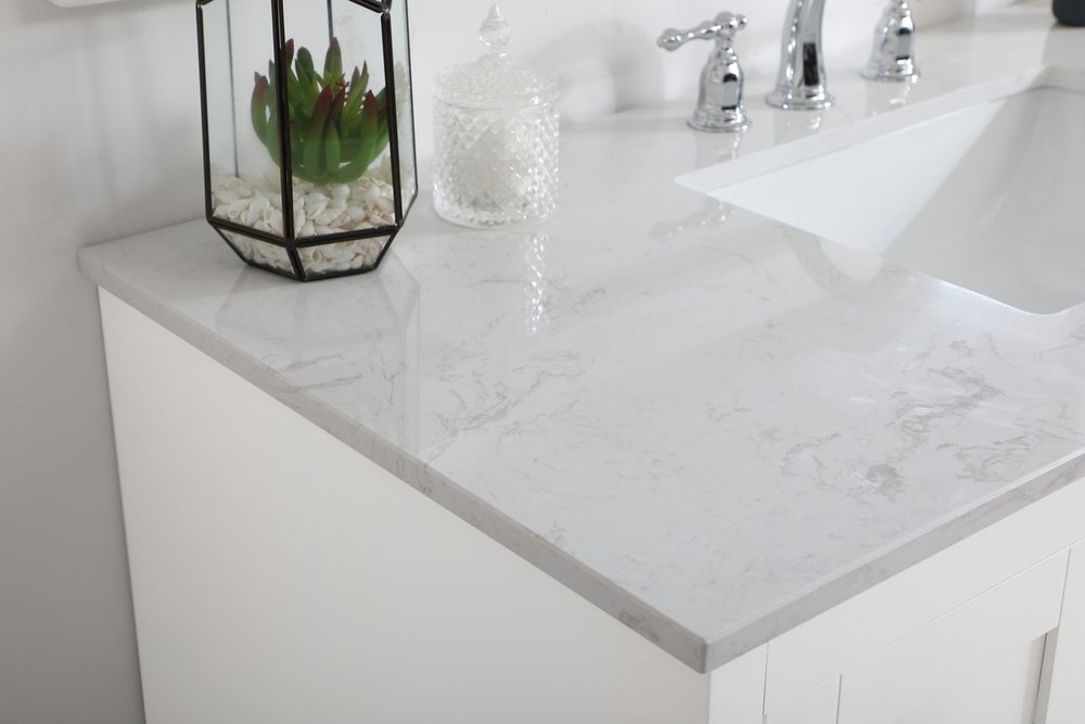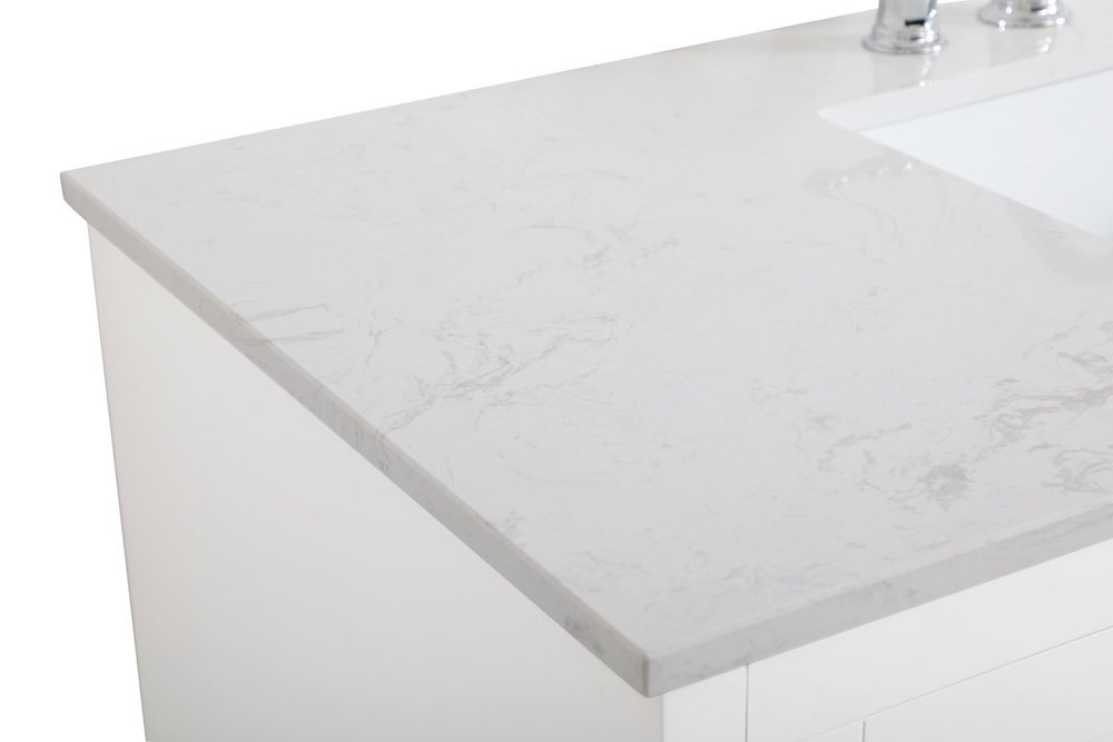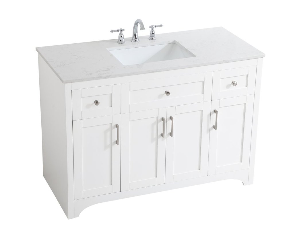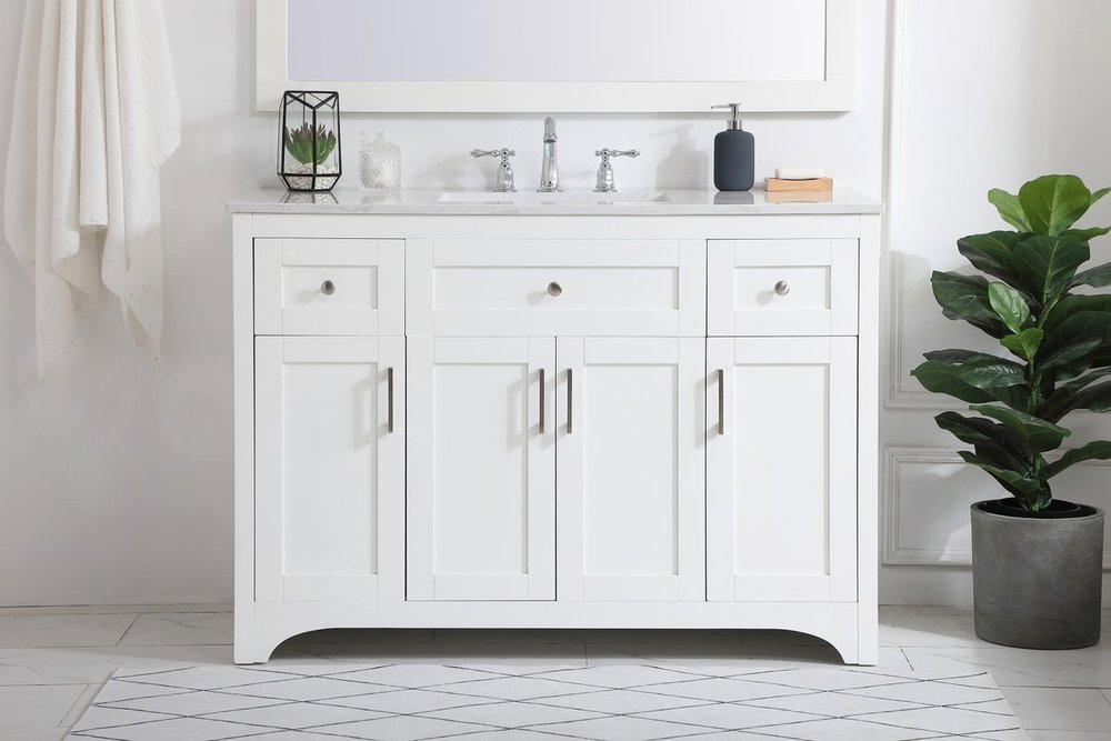 The refined simplicity of this 48" white finish vanity creates a peaceful, yet stylish, atmosphere. Its traditional modernity adds a mature beauty that will elevate any bathroom or powder room--the Calacatta engineered marble counter top adds refined luxe while the brushed nickel handle bars open the 4 cabinet doors and 2 upper drawers, revealing ample storage space to store and hide away an assortment of bathroom essentials. Whether your home is large or small, this vanity will surely fit in well.