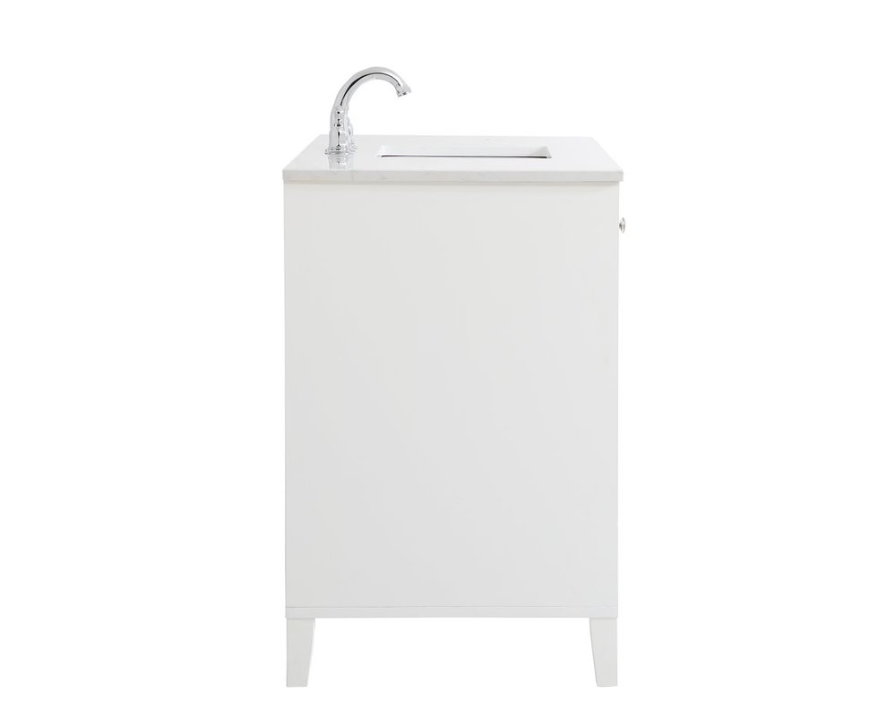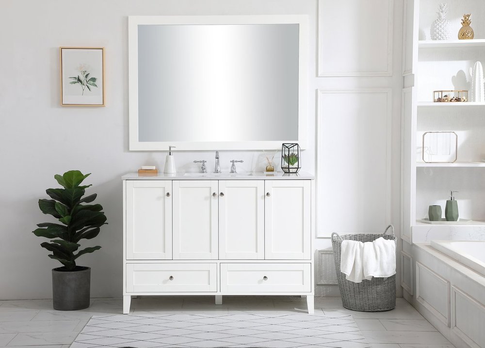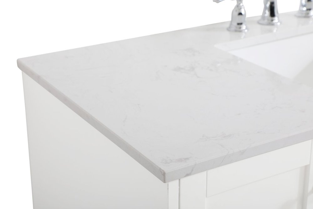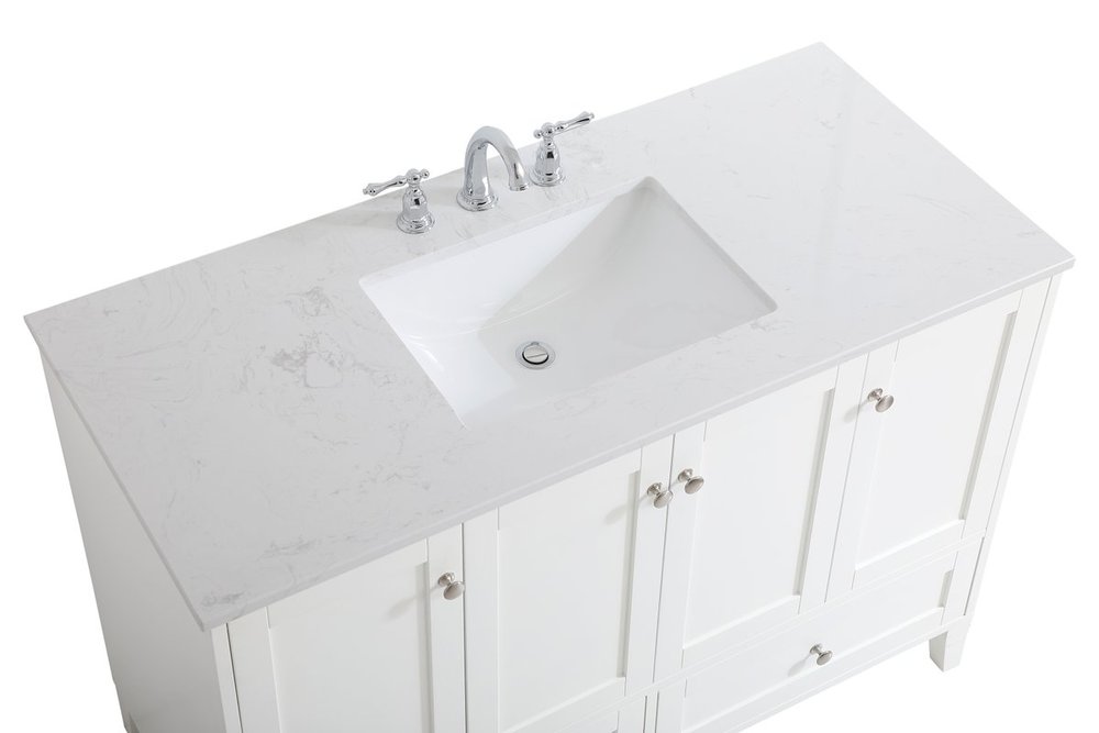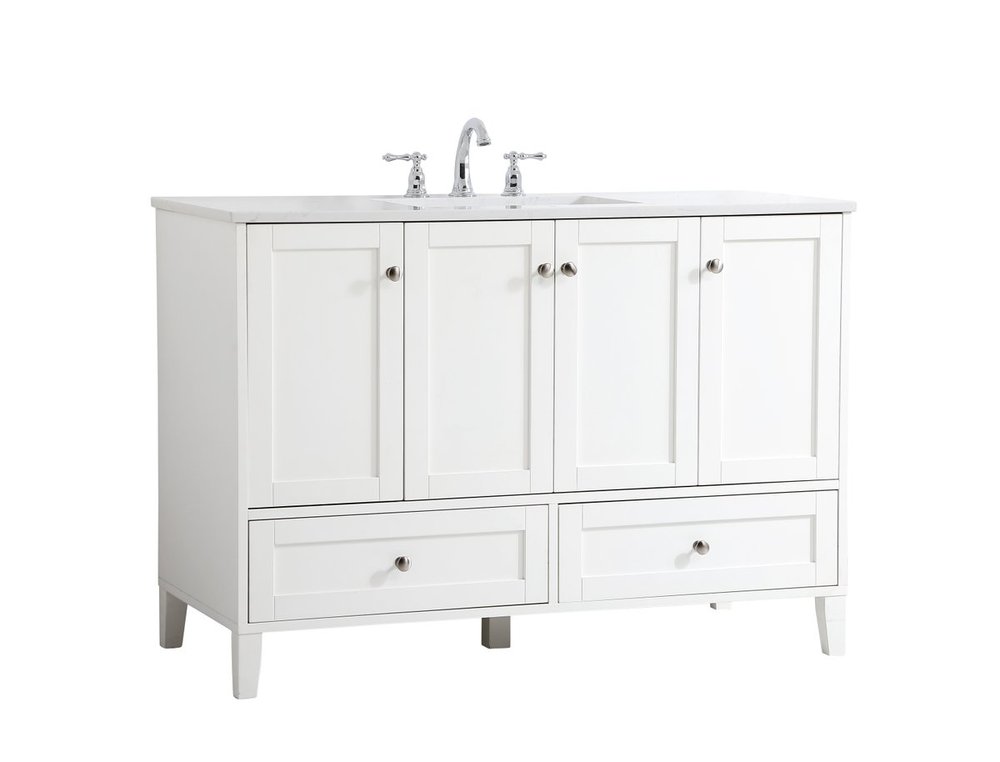 While unassuming, this 48" vanity in a white finish sure knows how to redefine luxury. The sleek brushed nickel knobs adorn the 4 cabinet doors and 2 bottom drawers which allow you to store your bathroom toiletries and necessities. Standing strong on oblique legs and dressed with a Calacatta engineered marble countertop, this vanity will surely create beauty and casual elegance in your bathroom or powder room.