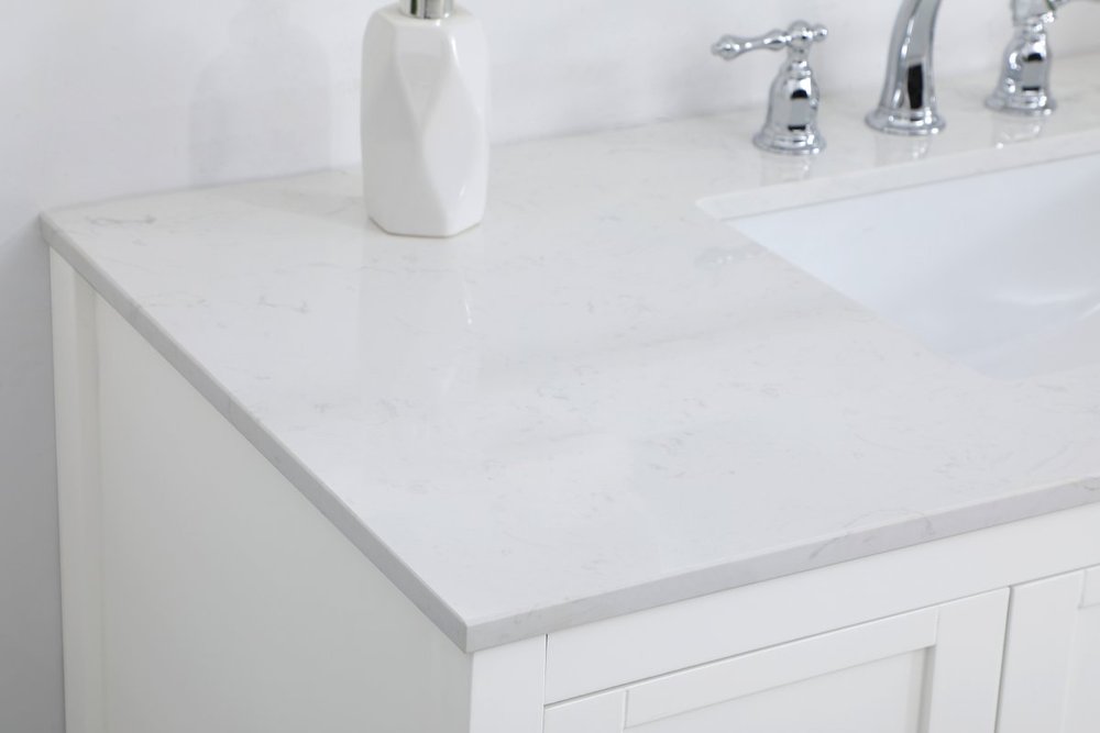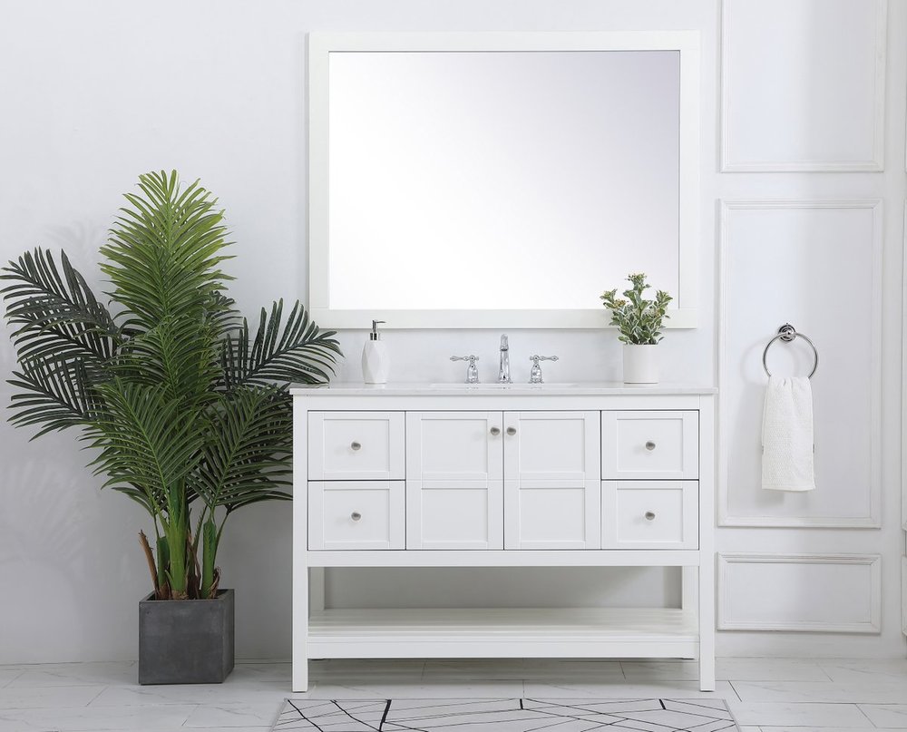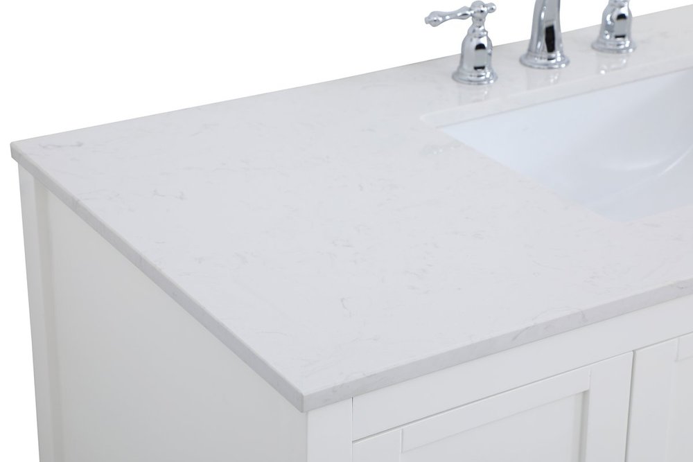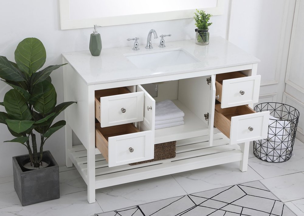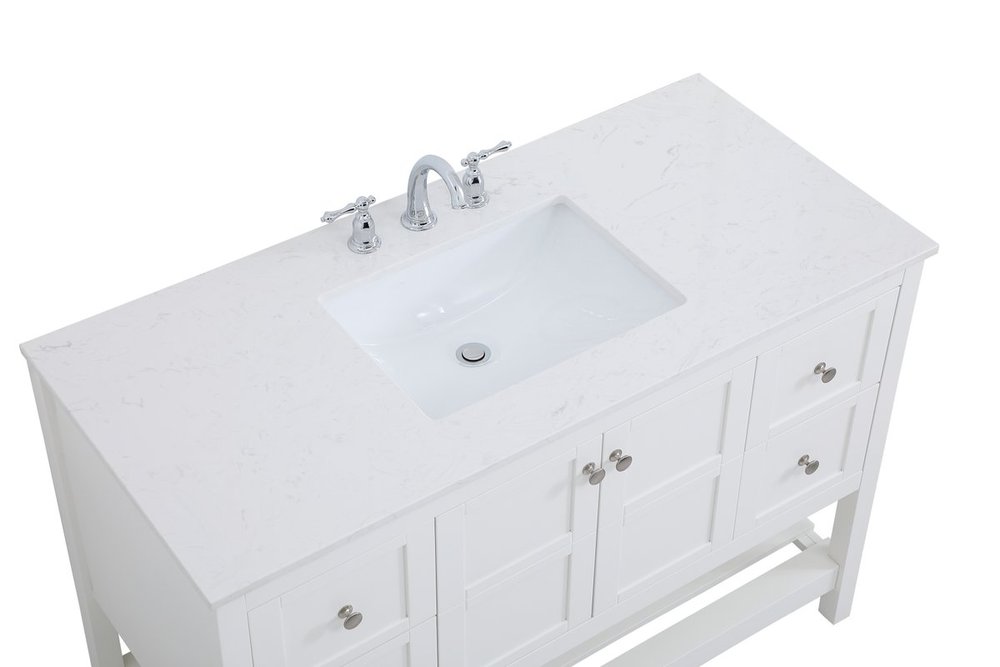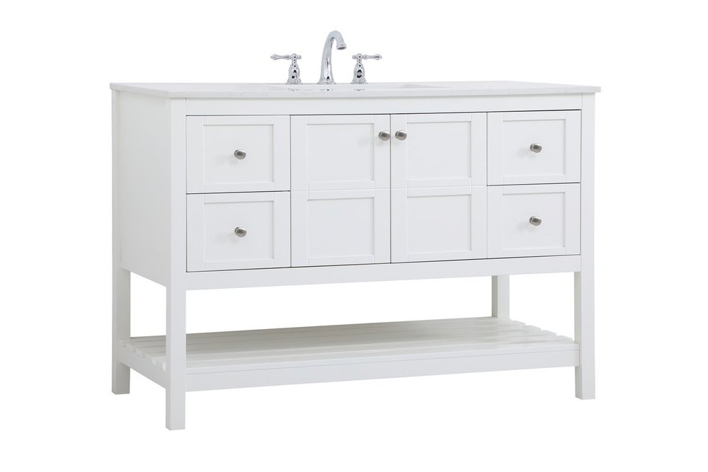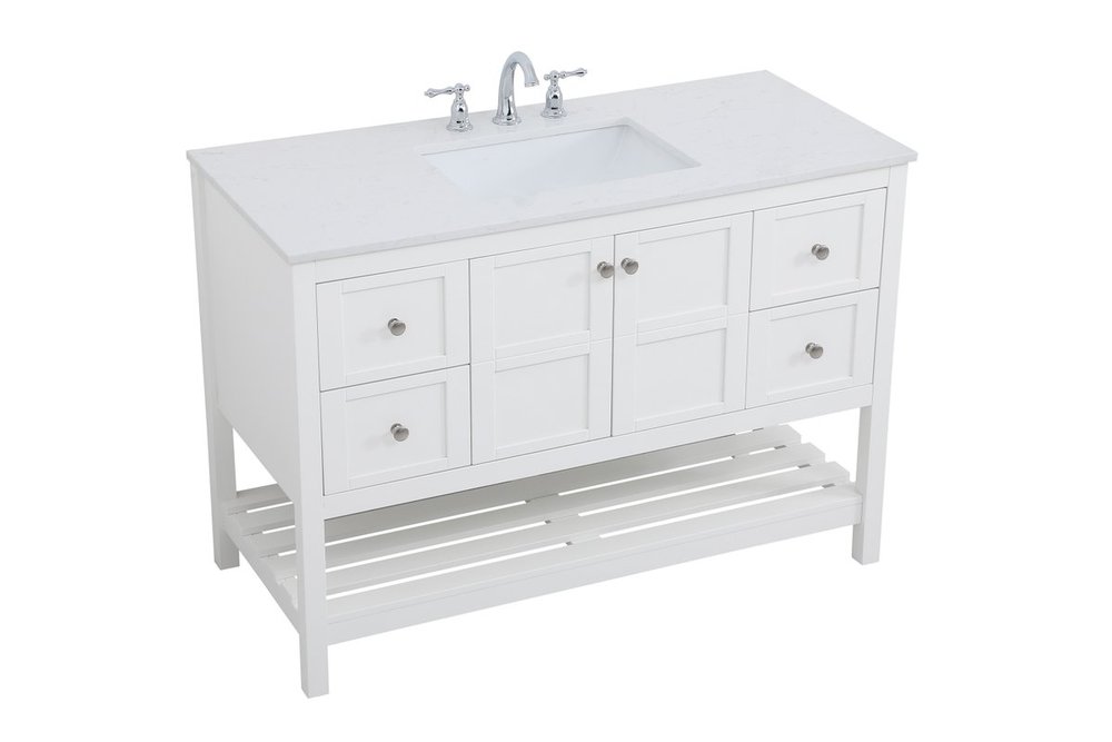 The subtle beauty of the Theo collection 48" vanity in a white finish exudes comfortable luxury. Its modern, yet traditional beauty will surely dress up your bathroom or powder room without any fuss. The white stone countertop and porcelain undermount sink shows quiet opulence, and the legs support upright without fail. Brushed Nickel hardware complements the trendy white finish, with pulls adorning the two cabinet doors and four drawers, showcasing ample storage space within. Slated shelf allows for additional space to organize your towels. Whether this vanity is in your bathroom or for guests, its presence will surely elevate the aesthetics of your room.