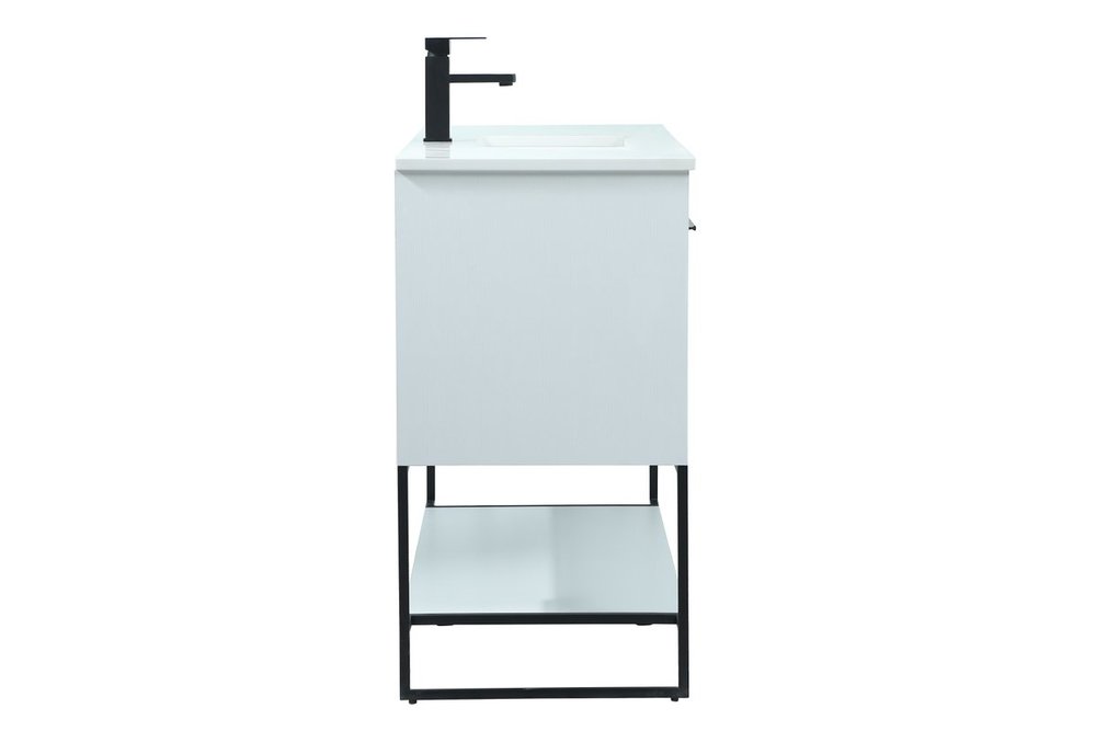 Live in modern comfort with this 48" white finish vanity. Dressed in a white and sleek black metal hardware, its contemporary style will have your bathroom or powder room elevated in industrial sophistication. The open shelf at the base and three doors reveal ample storage space for your bathroom essentials and miscellany. Clean lines create its own visual interest, adding trendy looks to your already chic room.