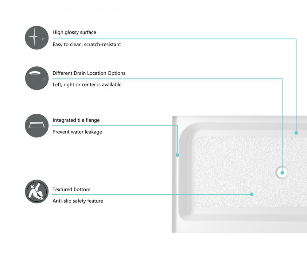 The clean and modern rectangular shape of our shower base complements any bathroom décor, adding a touch of elegance to your space. with three drain location configurations ( left, right, and center) to choose from, this makes a perfect choice!