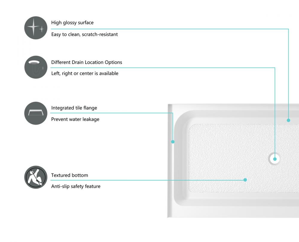 The clean and modern rectangular shape of our shower base complements any bathroom décor, adding a touch of elegance to your space. with three drain location configurations ( left, right, and center) to choose from, this makes a perfect choice!