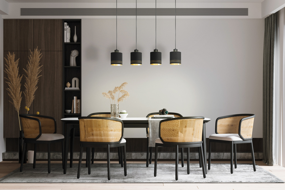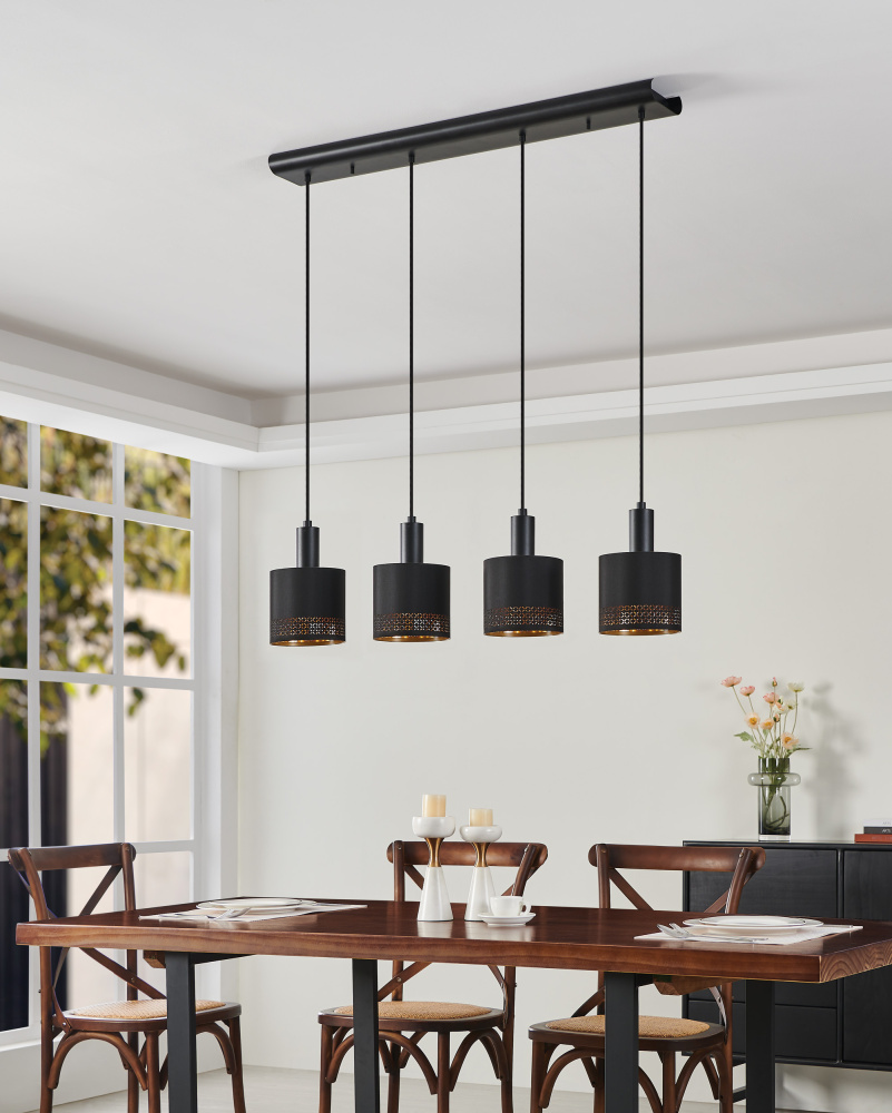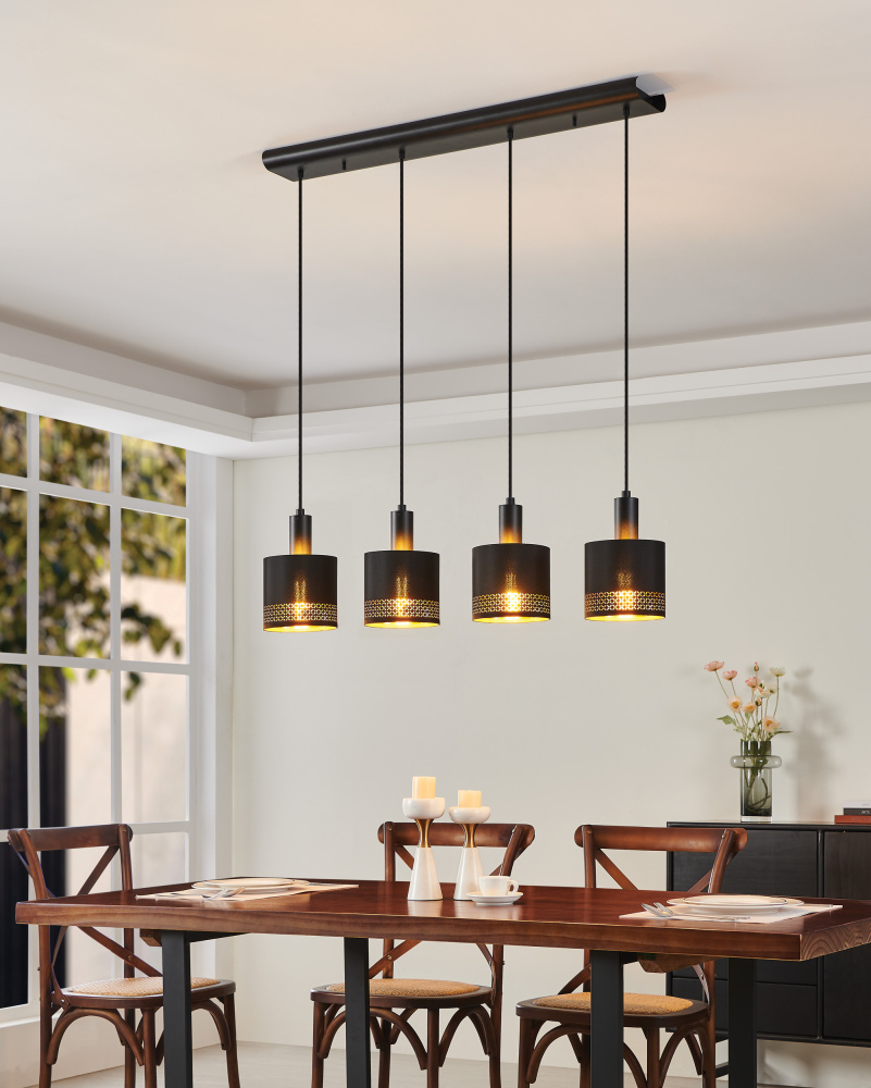 4 LT Linear Pendant w/ Black Finish & Black w/ Gold Interior Fabric Shades