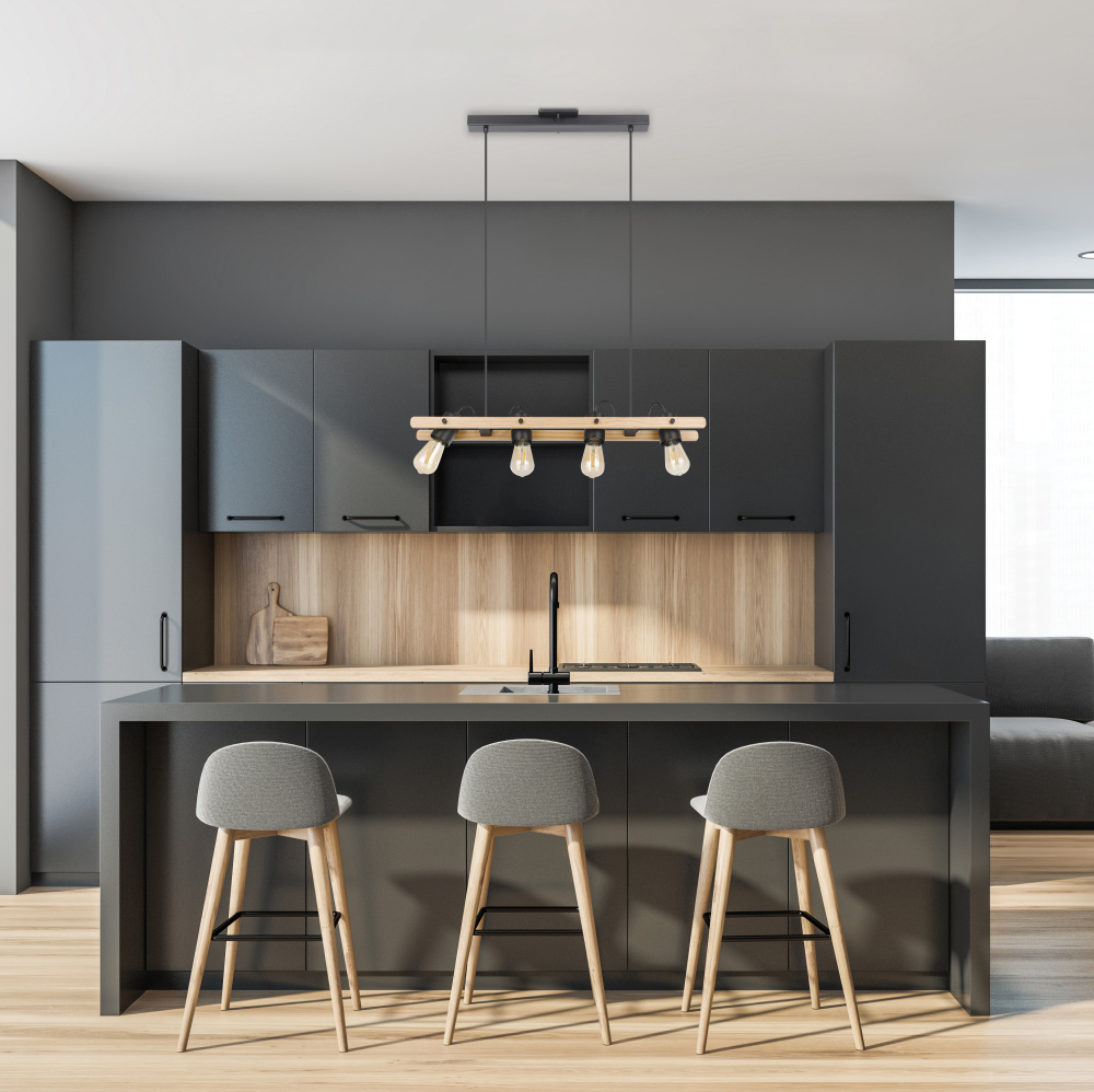 4 LT Open Bulb Linear Pendant w/ Black & Wood Finish