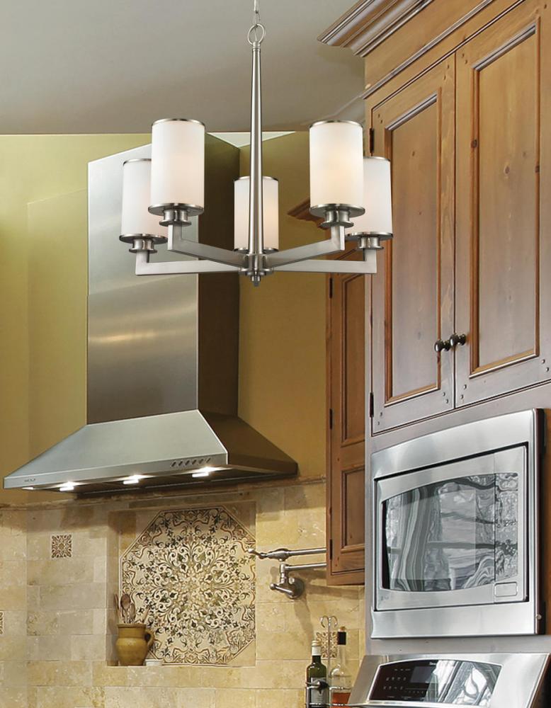 The contemporary Savannah family adds sophistication to home d?cor. The beautifully appointed brushed nickel fixture is perfectly paired with matte opal glass shades in this 5 light chandelier.