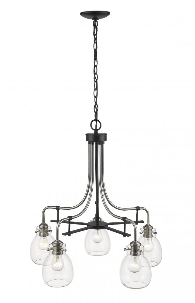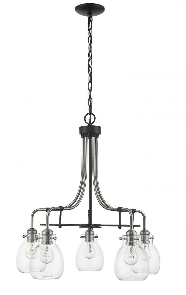 Elevate the sleek romance of a living room with the charming curves from this five-light metal chandelier. Clear glass shades beam brightly over the radiant brushed nickel finish, elevated with matte black.