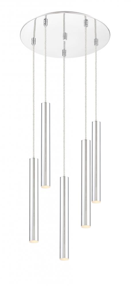Sleek lines from this five-light pendant light marry a rounded base. Chrome radiates throughout any space, adding depth to a modern motif.