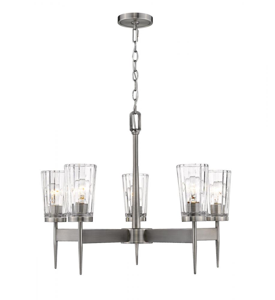 An intriguing silhouette with impressive materials allows this five-light chandelier to become part of an overall sophisticated design scheme. Gorgeous flared glass shades and sleek polished Antique Nickel finish extension stems in a geometric arrangement offer an upscale attitude and an efficient way to illuminate dining and living areas.