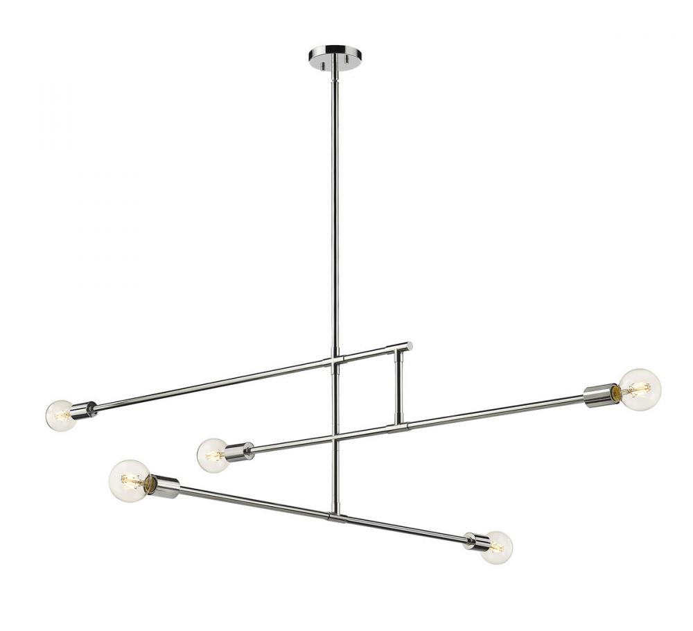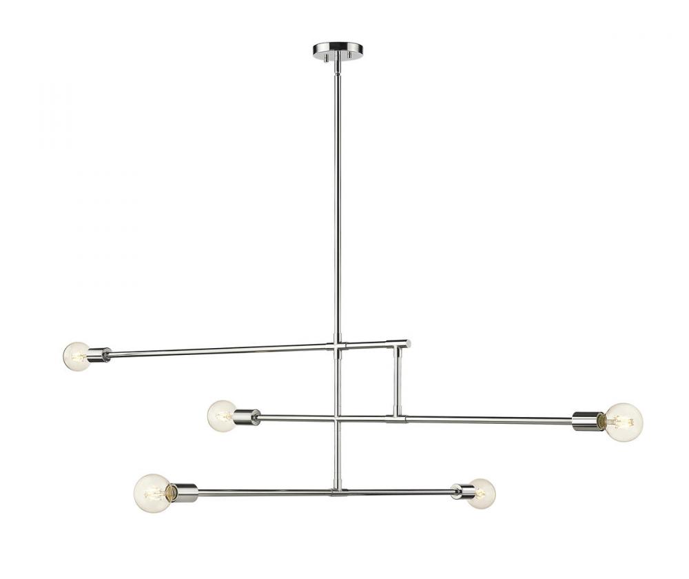 Bold linear styling adds surprising character to contemporary spaces, forming a linear shape that makes this five-light chandelier from the Modernist collection stand out as an uplifting accent with a hint of industrial flavor. Bring fresh lighting and elegant aesthetics to a modern dining or living space with this chandelier crafted of chrome finish steel construction. Stark geometric parallel and perpendicular silhouetting turns low-key, simple visuals into an eye-catching addition to primary d?cor.