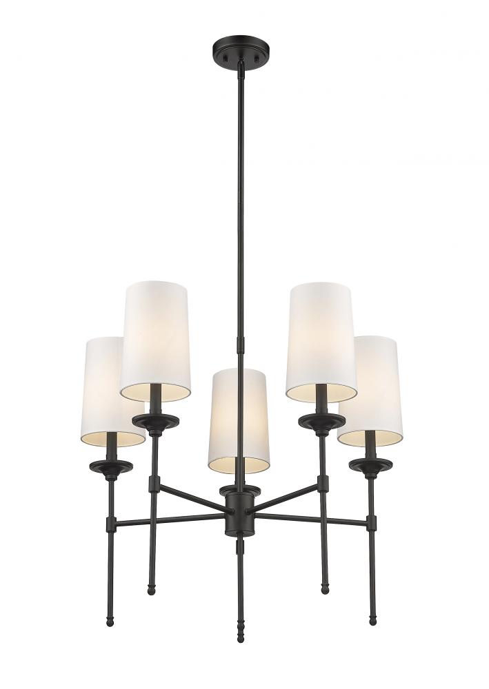 The Emily five-light chandelier adds a tasteful dose of decadence tempered by softness and transforms a dining space or living area with class. This fixture features a carefully aligned collection of five lamp-like lights with off-white shades that encircle a frame fashioned of matte black finish metal. A contrasting palette creates welcomed versatility to blend with variable ensembles, and a classic aesthetic fit for an upscale living space.