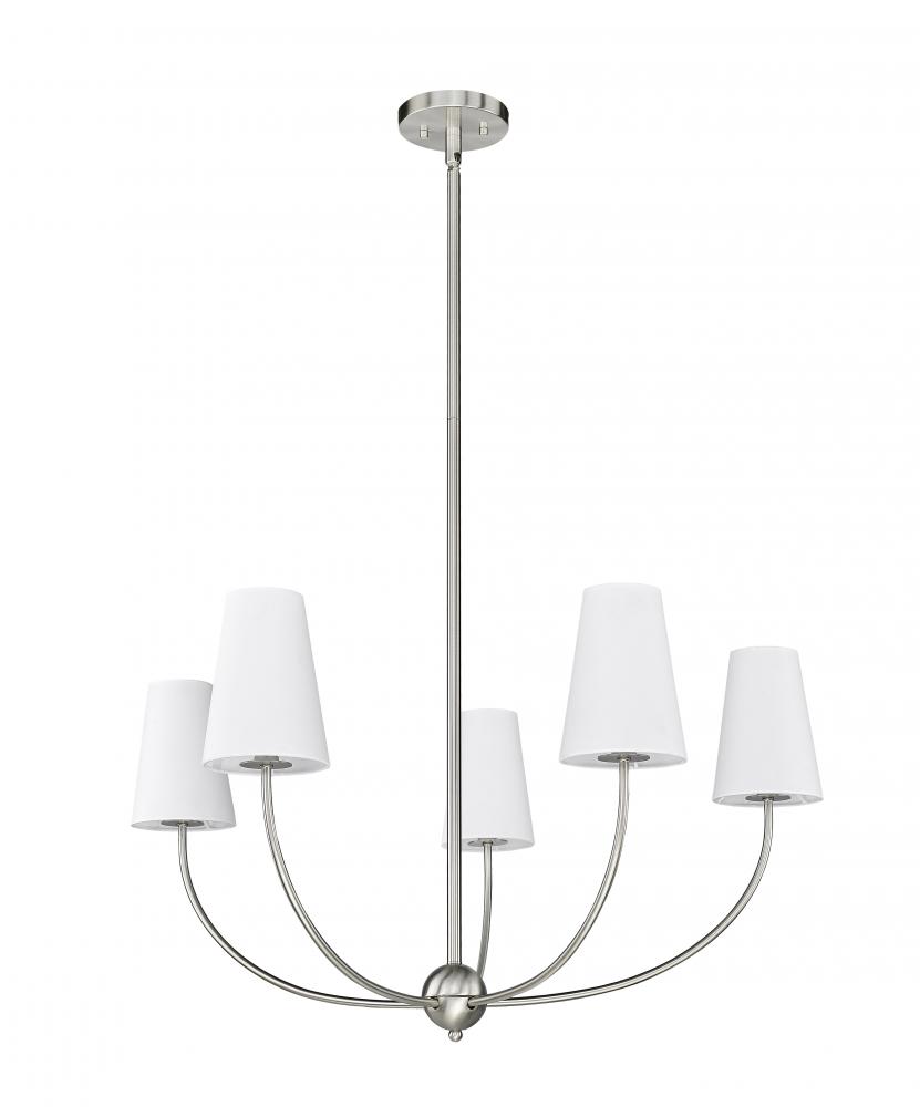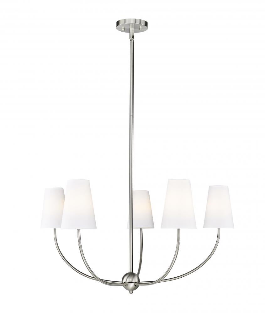 Reflect on a tasteful contemporary flavor in lighting for a modern or transitional space as the Shannon five-light chandelier delivers ambient lighting and a symmetrical silhouette. Embrace the graceful aesthetic of a brushed nickel finish steel frame with subtly curved arms culminating with lights capped with classic white fabric shades. This minimalist chandelier tells a story of measured elegance suited to a dining space, kitchen, or entryway.