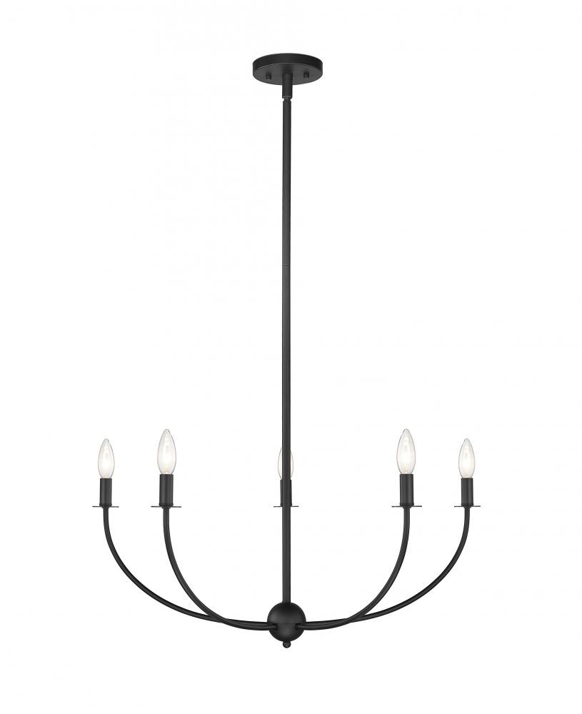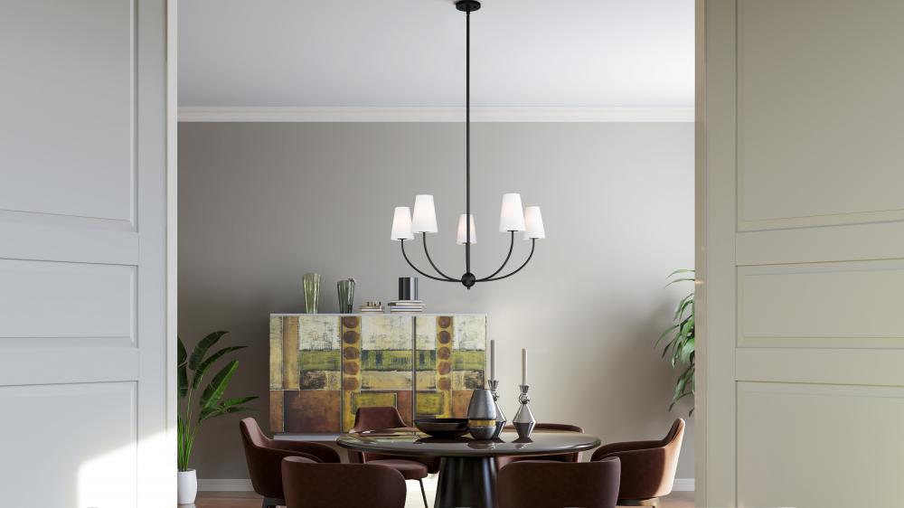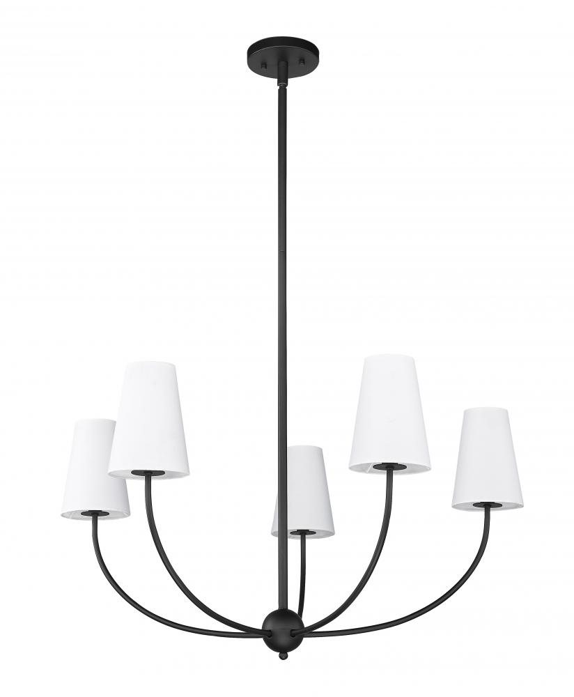 The Shannon five-light chandelier delivers ambient lighting and a symmetrical silhouette with low-key elements and crisp contrast. Embrace the graceful aesthetic of a matte black finish steel frame with subtly curved arms culminating with lights capped with classic white fabric shades. This minimalist chandelier tells a story of measured elegance suited to a dining space, kitchen, or entryway.