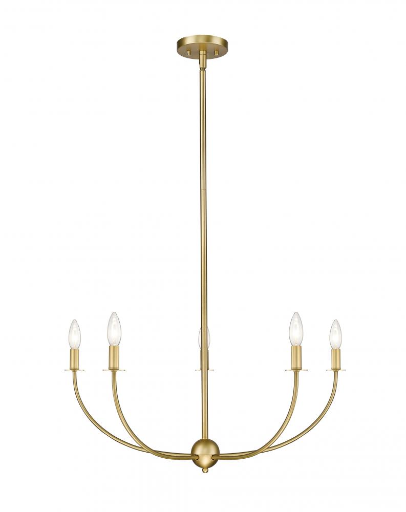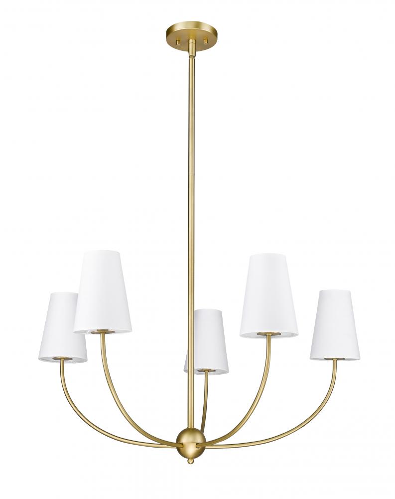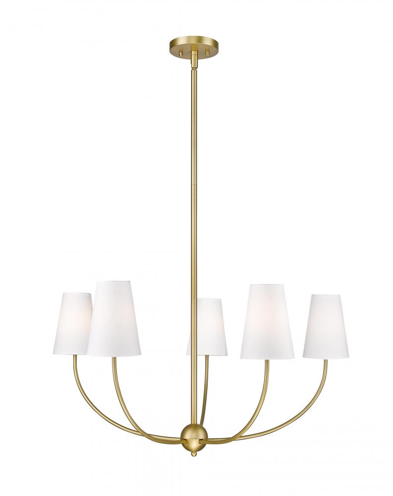 A warm, rich finish and symmetrical silhouette with low-key elements offer tasteful ambiance to the Shannon five-light chandelier. Embrace the graceful aesthetic of a warm rubbed brass finish steel frame with subtly curved arms culminating with lights capped with classic white fabric shades. This minimalist chandelier tells a story of measured elegance suited to a dining space, kitchen, or entryway.