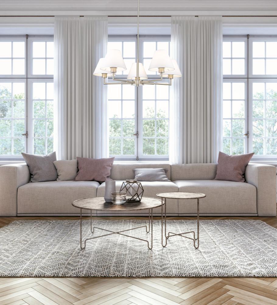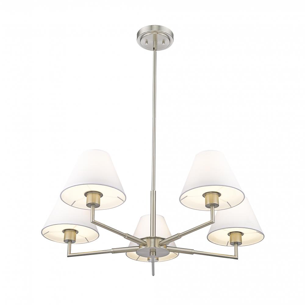Modern flexibility of design plays up the chic, understated character of a five-light chandelier. Expertly designed with simplicity at the forefront, the chandelier pairs a brushed nickel finish frame with straight suspension and complementary angularity, all capped with conical shades that create the perfect hint of dimensionality for a fixture that looks great everywhere from the dining room to a bedroom dressing area.