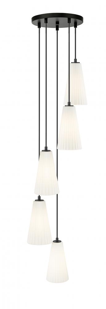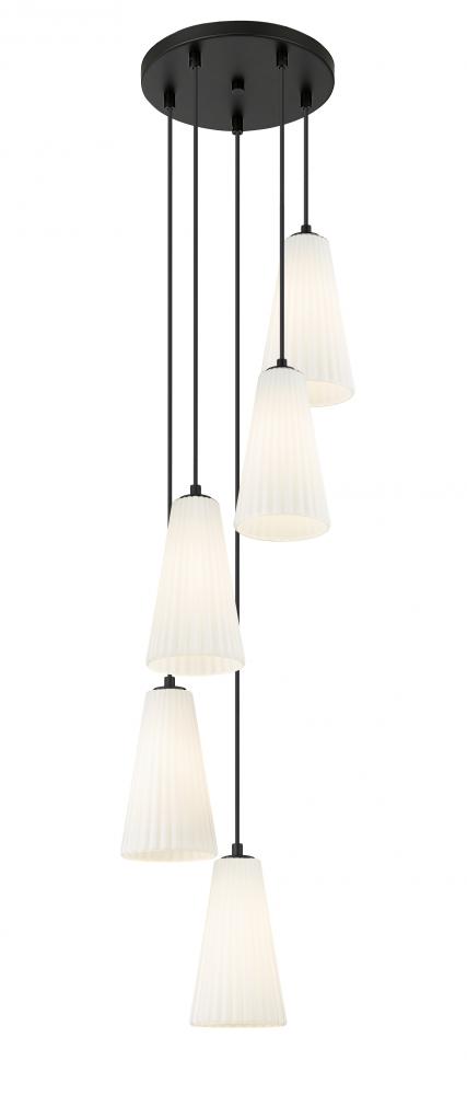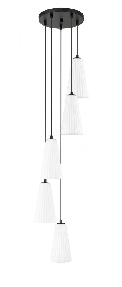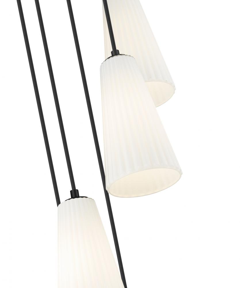 We love the delicate spiraling fall of elongated shades featured in this modern five-light chandelier. Stunning over a staircase or foyer, its a gorgeous combination of fluted frosted glass shades and a matte black accent finish, creating a sophisticated presentation that brims with depth and texture.