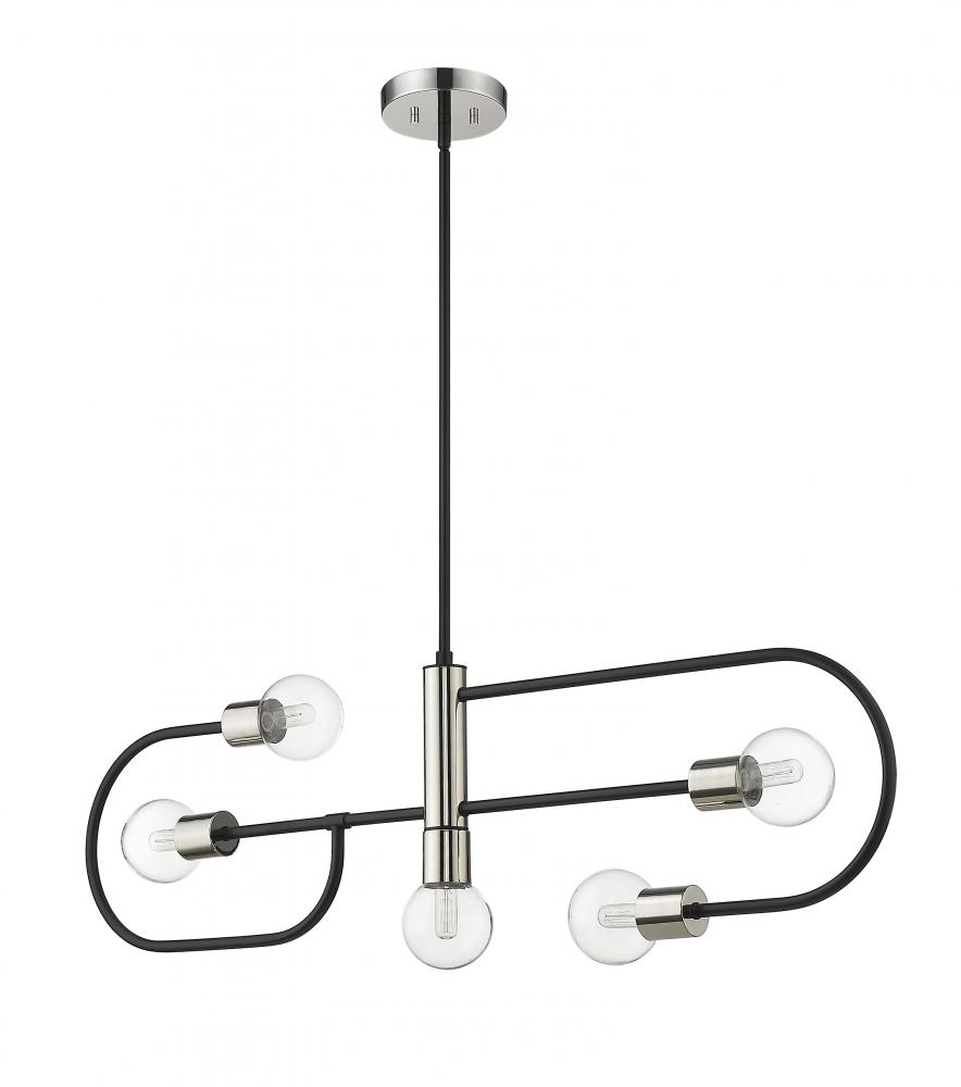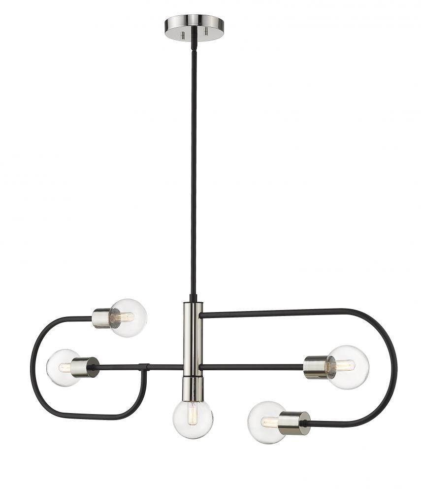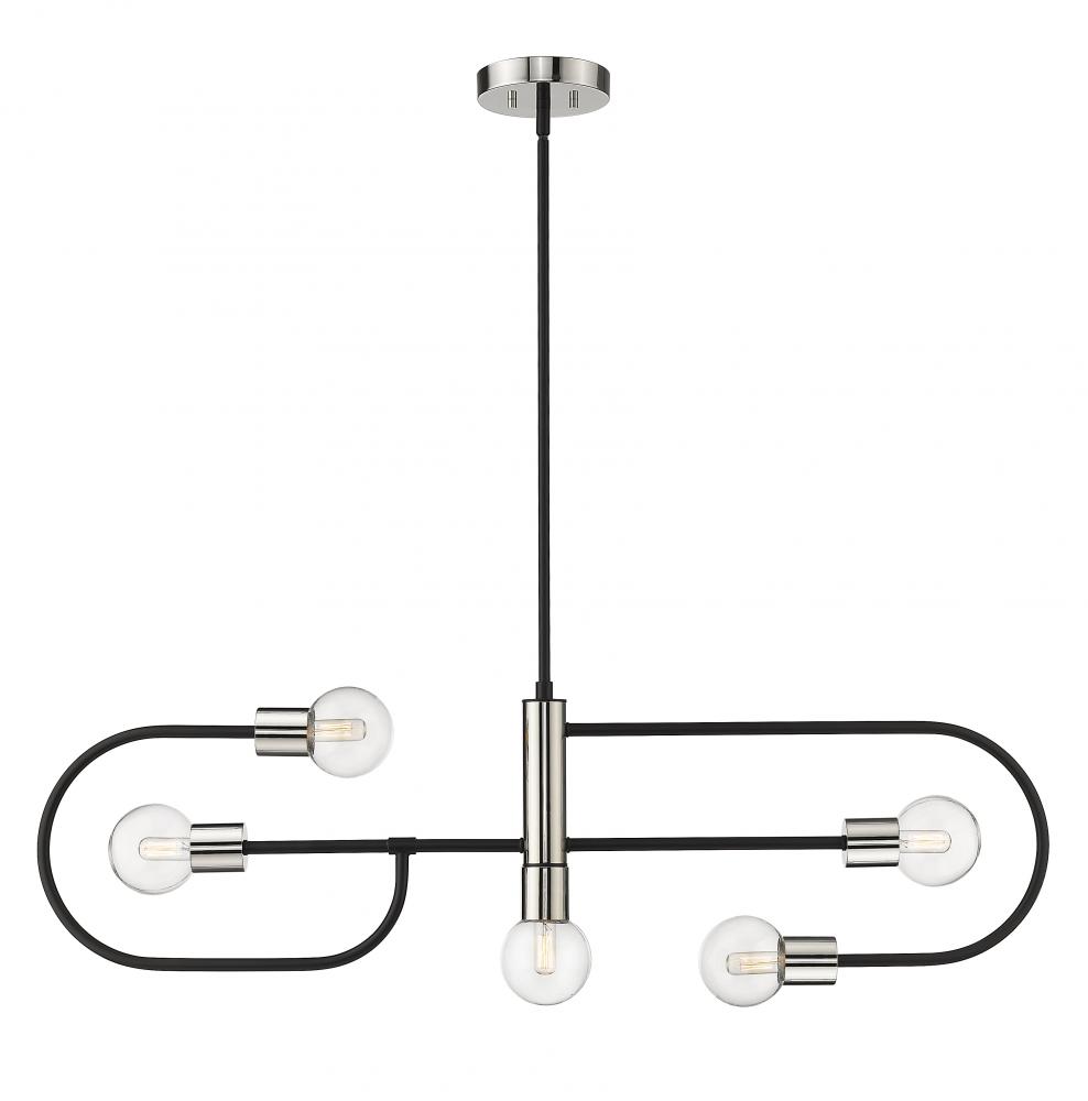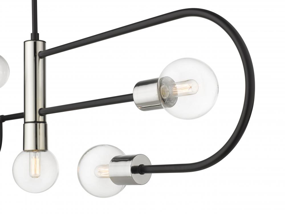 From the Neutra collection comes this vintage-inspired island light fixture, lending a charming mid-century modern flair to a contemporary style home. Five clear glass globes at each end of staggered, curved matte black rods, accented with a shiny polished nickel finish, cast a bright glow across the space. Hang this dapper and classy steel lighting piece over a kitchen island or a billiard table in the game room for a retro Art Deco vibe.