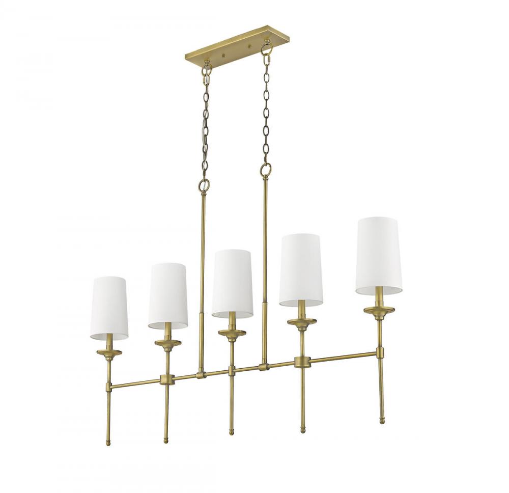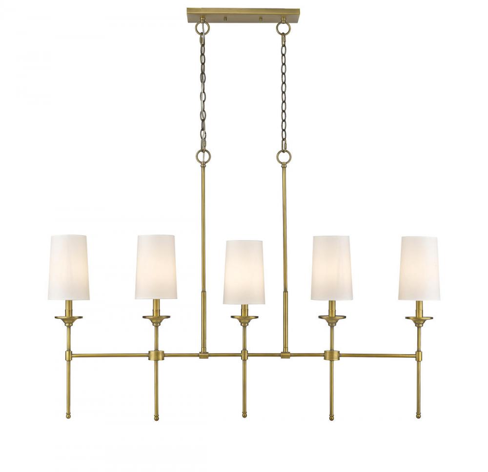 Transform a traditional dining room with the Emily chandelier. Sleek and elegant, this metal chandelier features five off-white cloth shades affixed to a slim, steel frame. Complete with a gleaming polished nickel finish, this fixture beautifully illuminates a room with soft, diffused light.