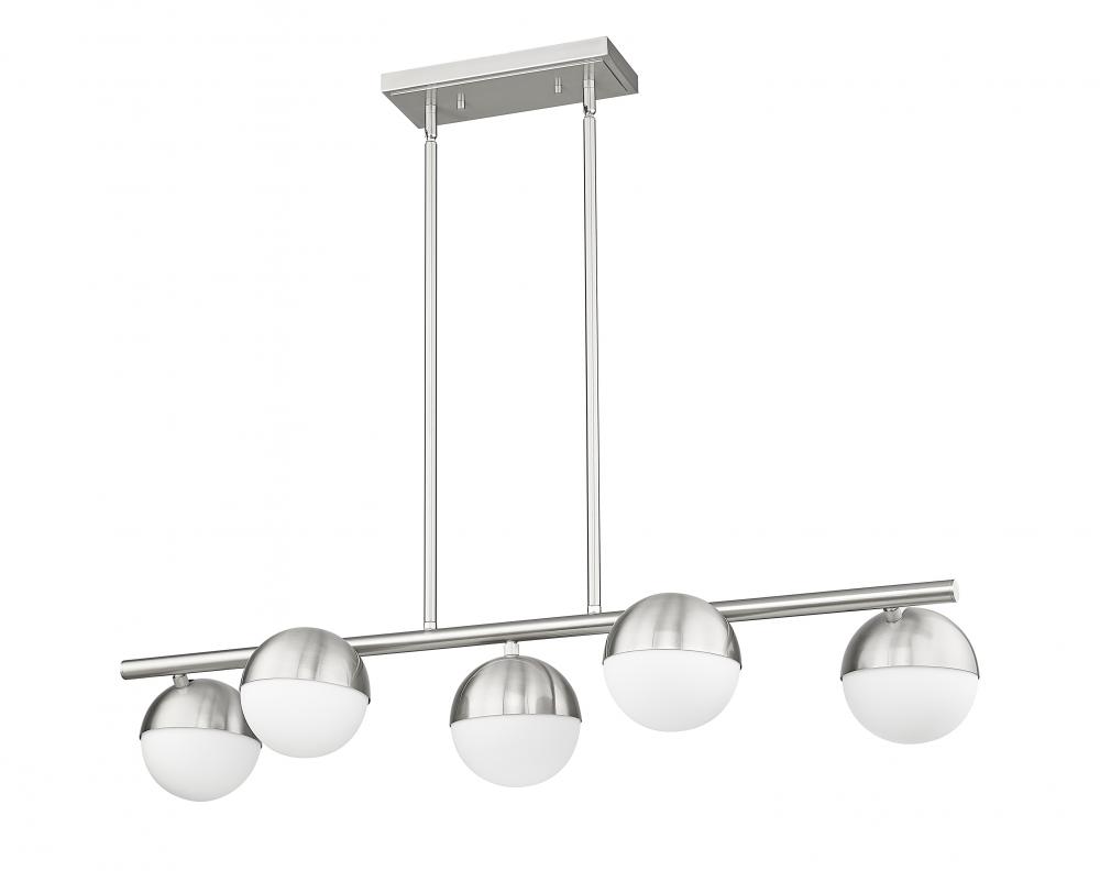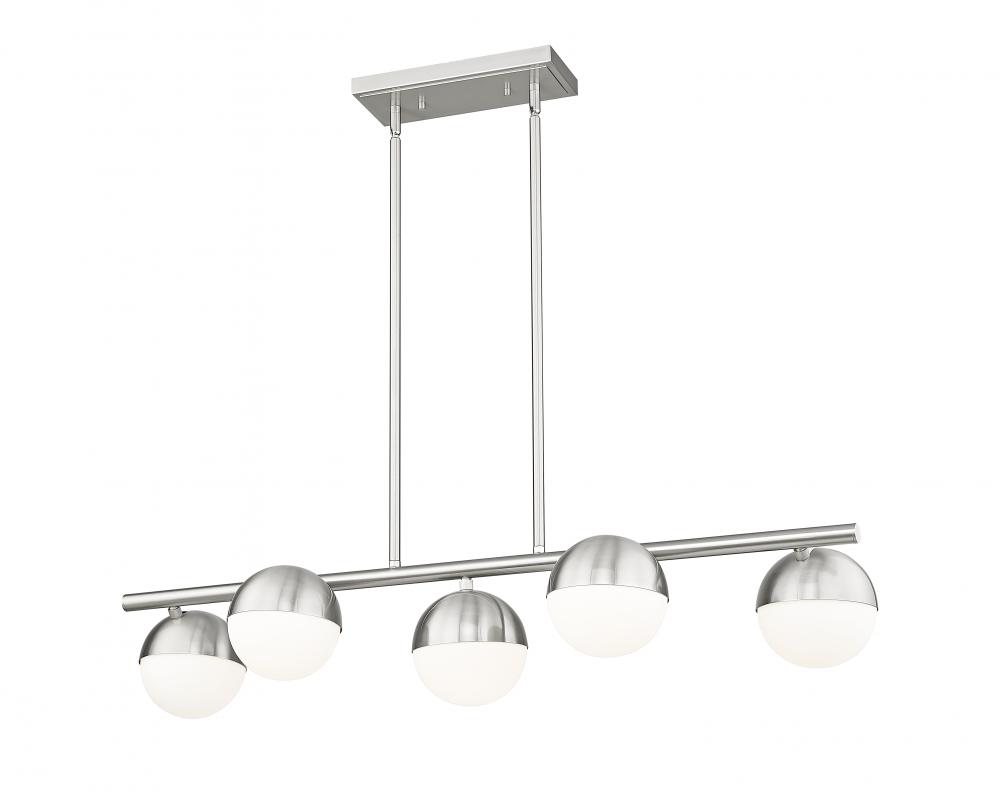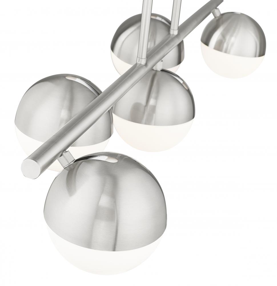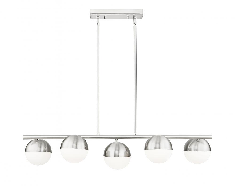 Offset orbs create a compelling linear silhouette for this modern five-light island chandelier. Perfect for your kitchen, it boasts a clean-lined profile with a sleek brushed nickel finish. Its five lights are surrounded with opal glass orbs and boast metal shields for a chic, custom look and feel.