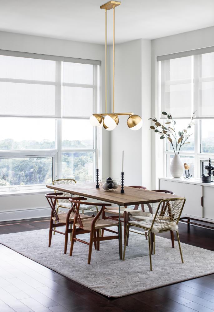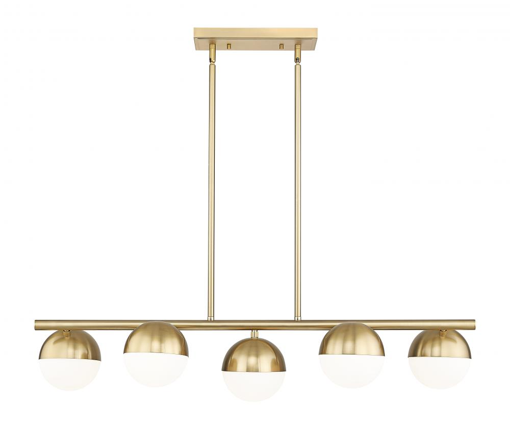 The charming ambiance created with the offset light configuration of this modern five-light island chandelier sets a playful tone. Its a linear design ideal for dining or gaming tables, creating bright, diffused illumination with opal glass orb shades and metal shields. A modern gold finish imparts lovely warmth and sophistication to your space.