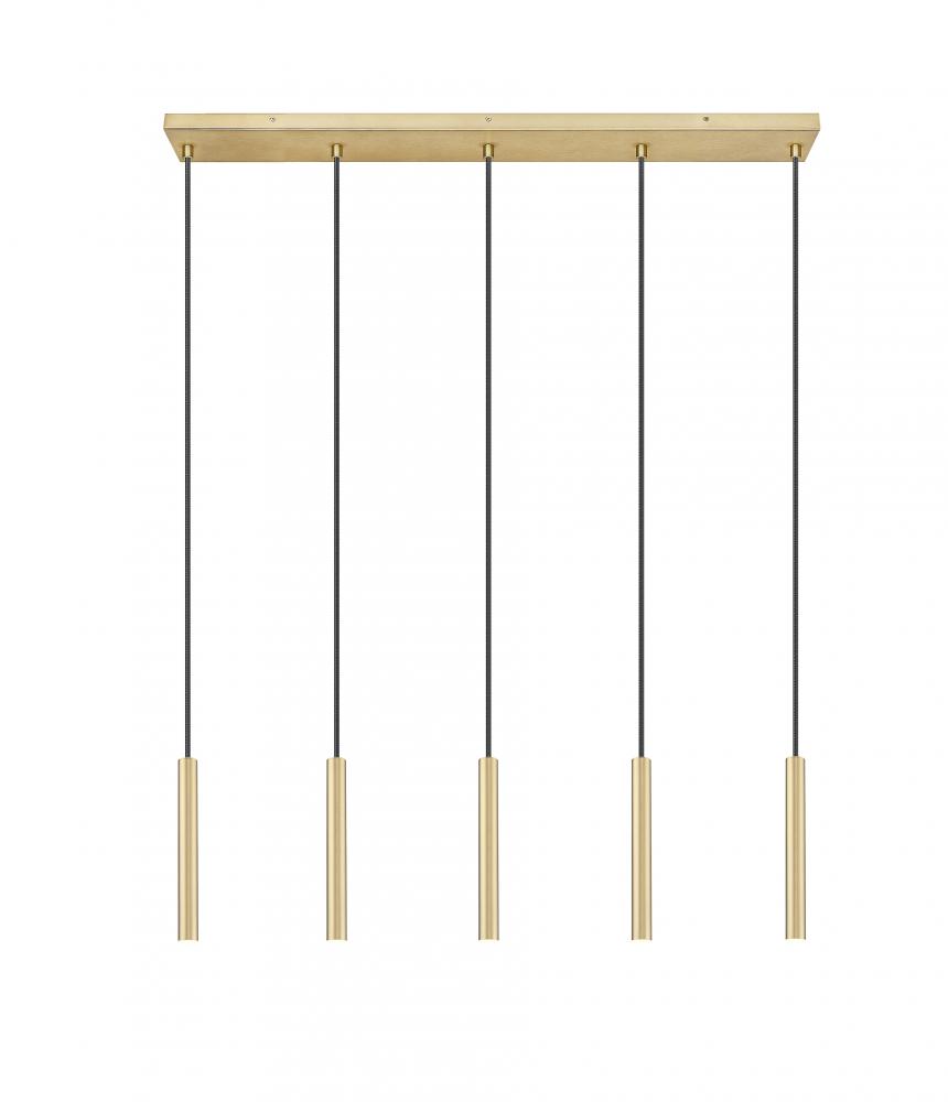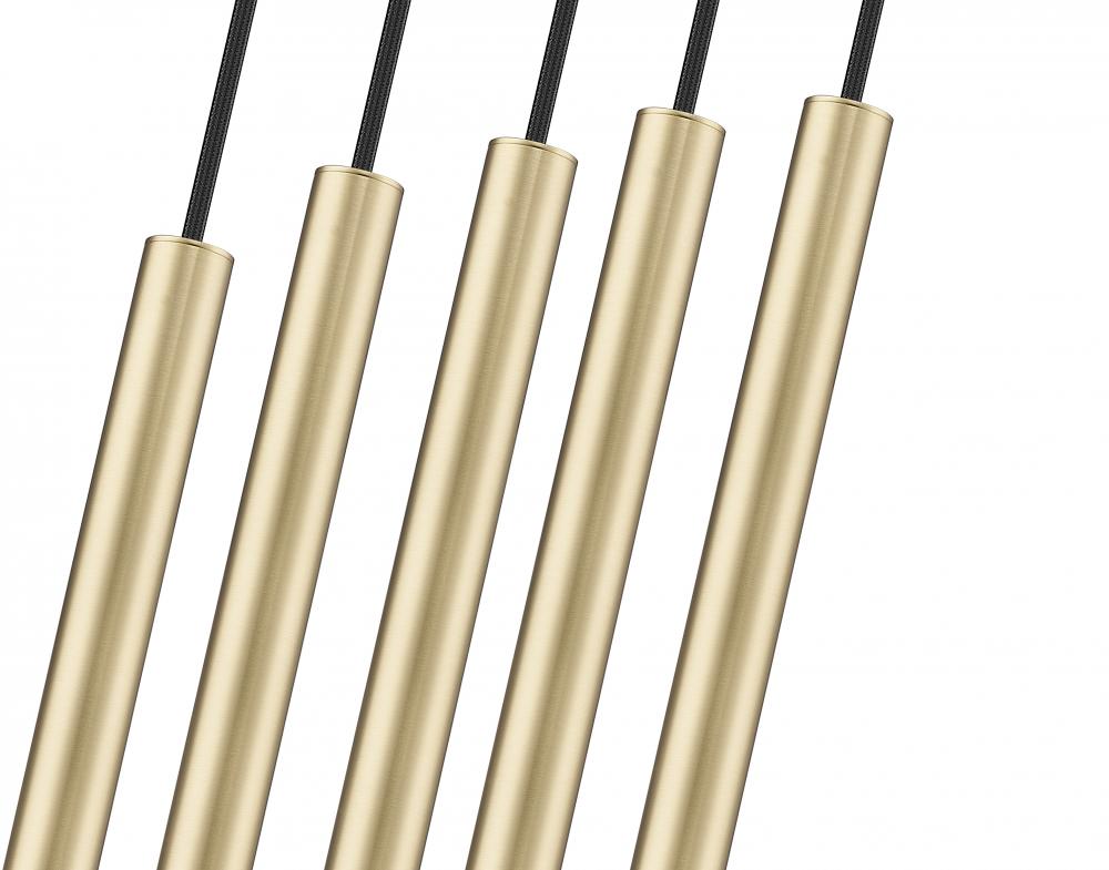 Embrace warm sophistication with a modern five-light linear chandelier from the Forest collection. Its a streamlined silhouette with a slender canopy and slim housings, all in a lovely warm modern gold finish over steel construction. Integrated LED lights are energy efficient and dimmable, perfect for a contemporary kitchen or dining room.