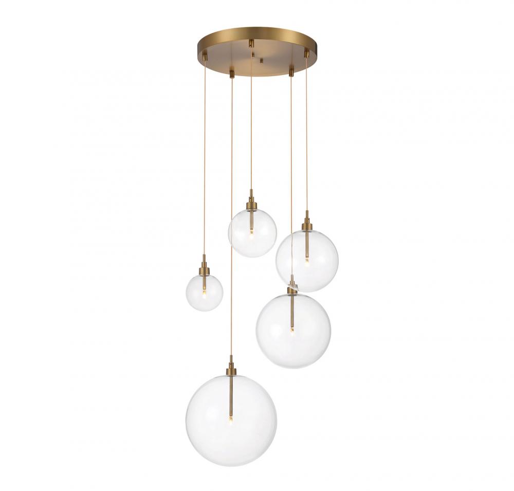 This Meridian 5-light pendant showcases clean, minimal styling with hand-blown orbs of clear glass and a natural brass finish. You can adjust the hanging height of each light for total customization! Bi-pin T4 LED bulbs included.
