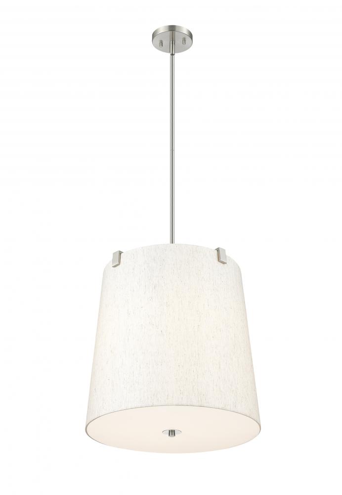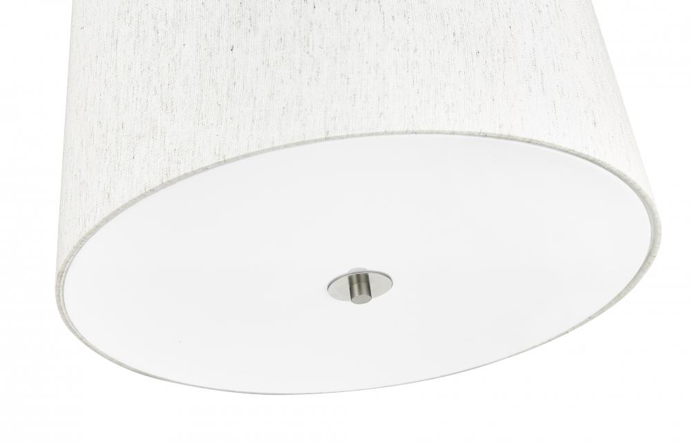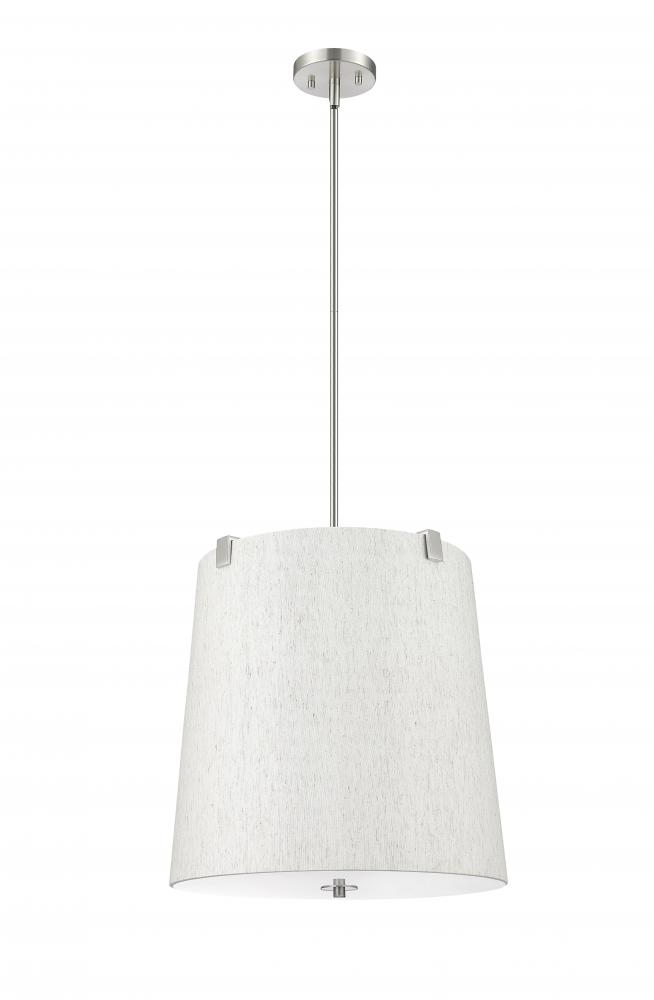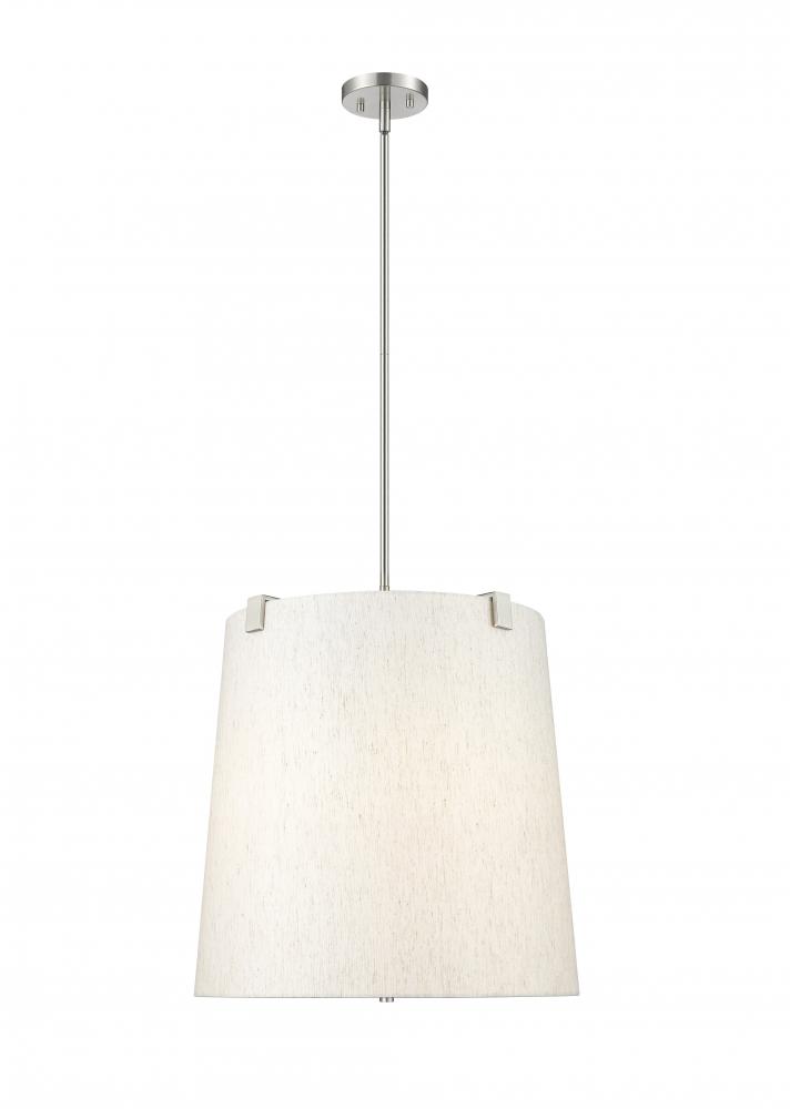 Exploit the chic sophistication of a fixture with plenty of versatility and a twist on traditional aesthetics. This five-light pendant highlights islands or living spaces with a low-profile look, blending cool brushed nickel steel framing and accent clips to a cream fabric shade, as candelabra lights filter through the diffused shade. This dimmable fixture offers variable lighting levels to suit different spaces.