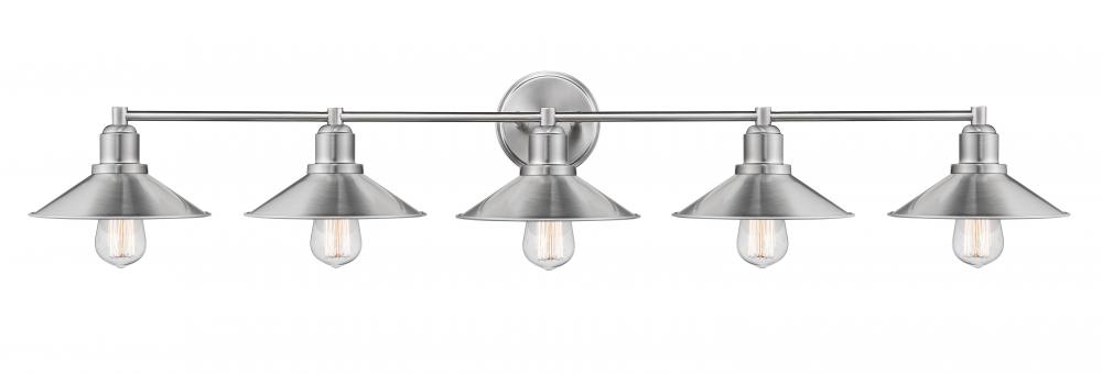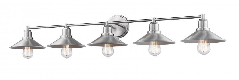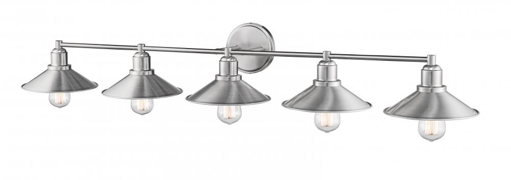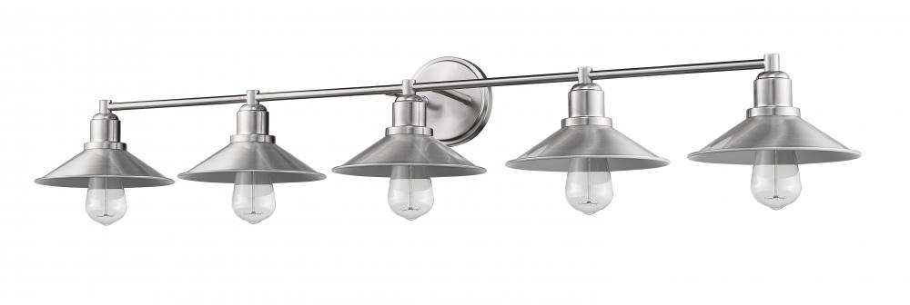 This elegant five-light vanity fixture positions itself as a marquee design element in a master en suite. Enjoy the antiqued effect with modern appeal, and find versatile beauty in a brushed nickel finish steel frame and hood shades.
