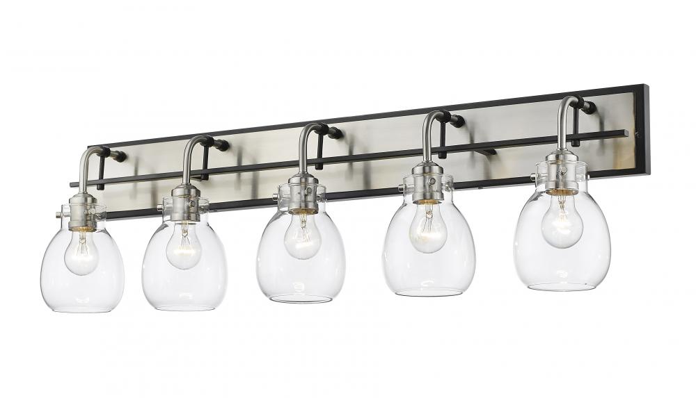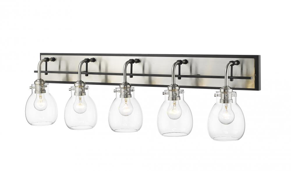 Matte black and shiny brushed nickel marry on the sleek silhouette of this five-light bath light. Decorate a modern bathroom with the elongated silhouette and bright, clear glass shades.