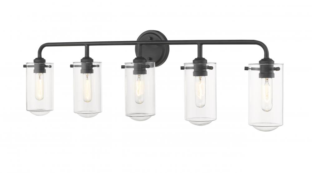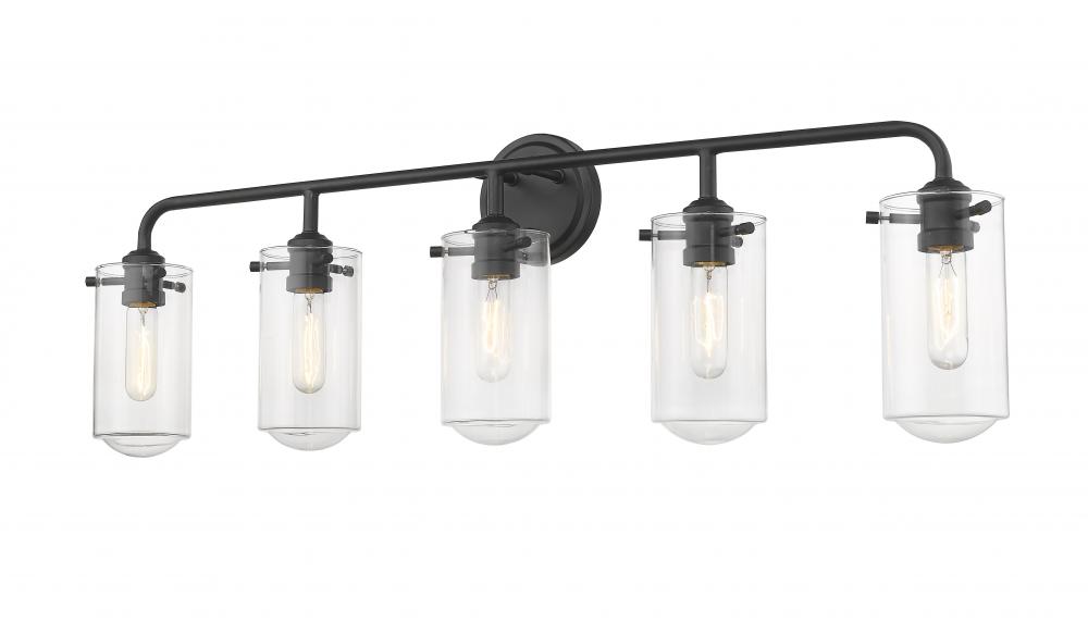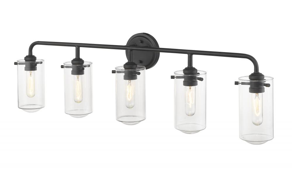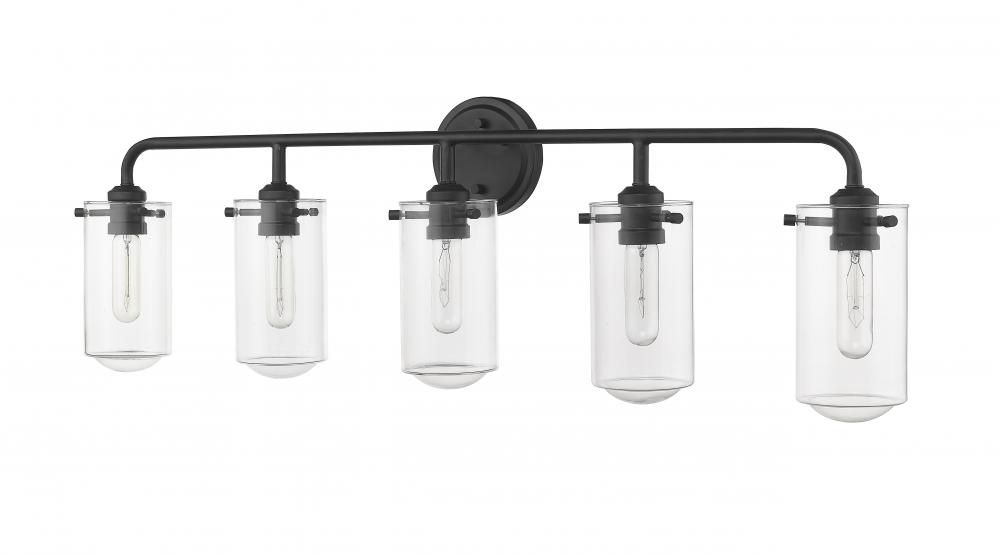 Make design work in your favor as you frame a master or guest bath suite sink. With delicate clear glass bulbs and a sleek matte black finish frame, this five-light bath light offers a tasteful, charming industrial theme and an artistic attitude.