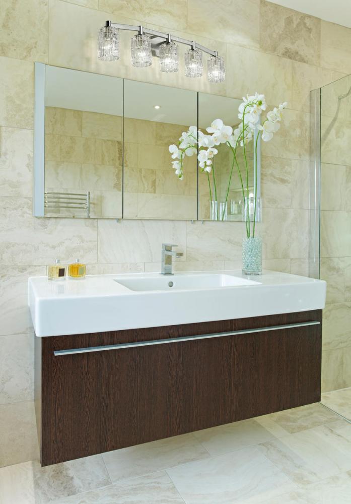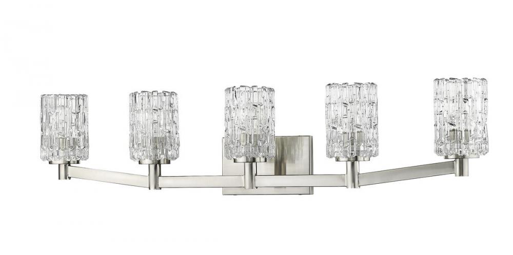 A contemporary haven is bejeweled with glam as this exquisite five-light vanity light becomes a focal point in a modern bath space. Crystal-like glass shades add an air of exclusivity to a fixture with a beautiful Brushed Nickel finish metal mount and arms, and an air of high-class, upscale elegance that frames a decadent vanity.