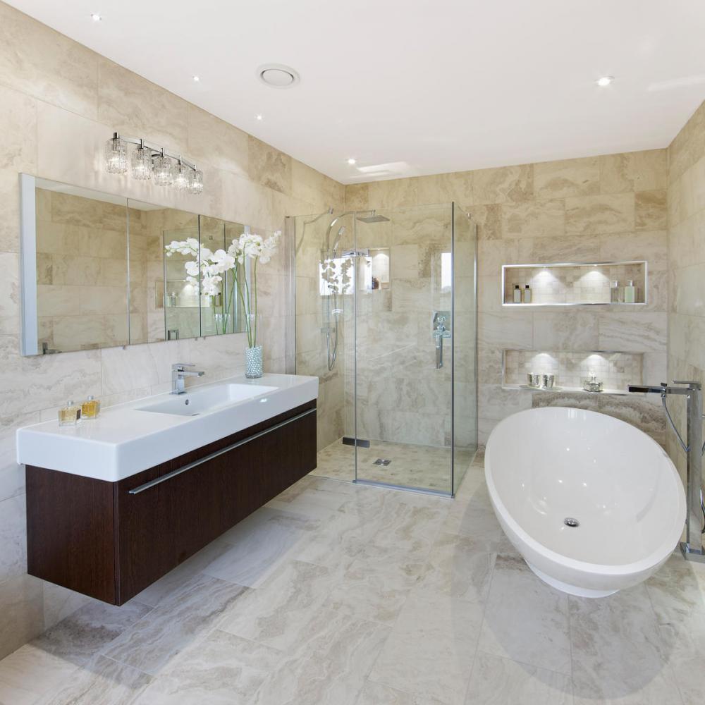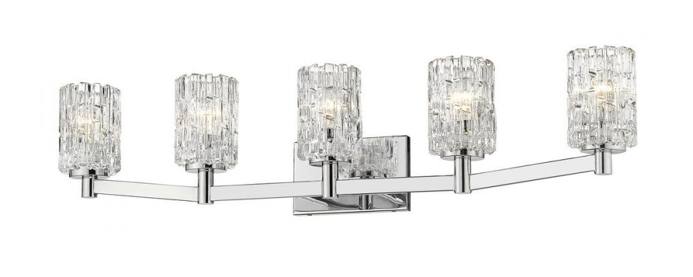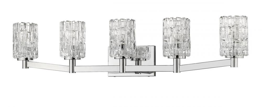 A contemporary haven is bejeweled with glam as this exquisite five-light vanity light becomes a focal point in a designer bath space. Crystal-like glass shades add an air of exclusivity to a fixture with a sleek Chrome finish metal mount and arms, and an air of high-class, upscale elegance.