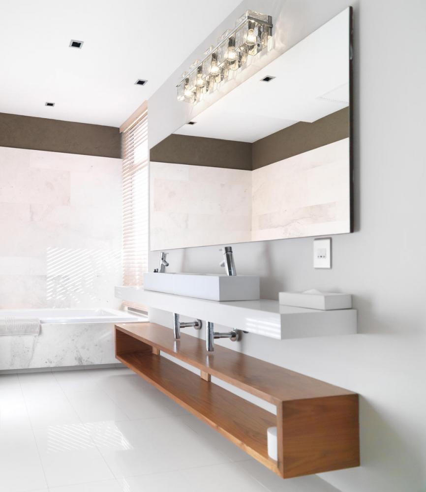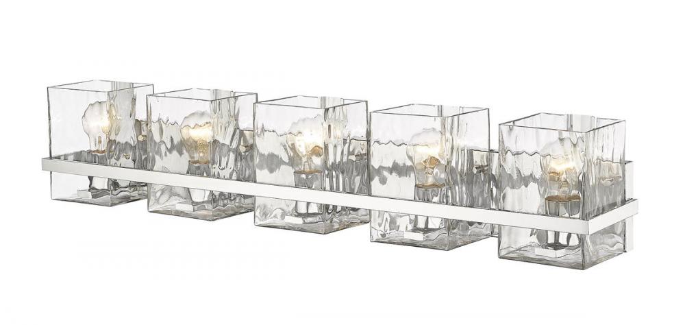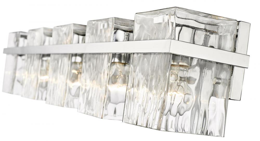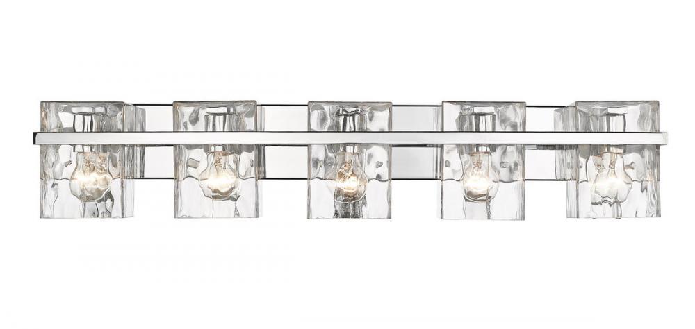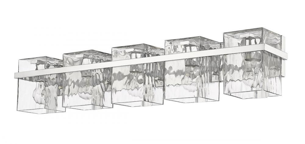 Rippled clear glass shades serve as a focal point on this five-light vanity. The fixtures steel is enhanced with a chrome finish while captivating with clean lines.