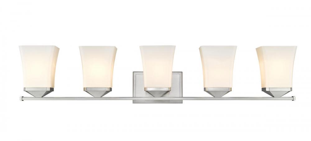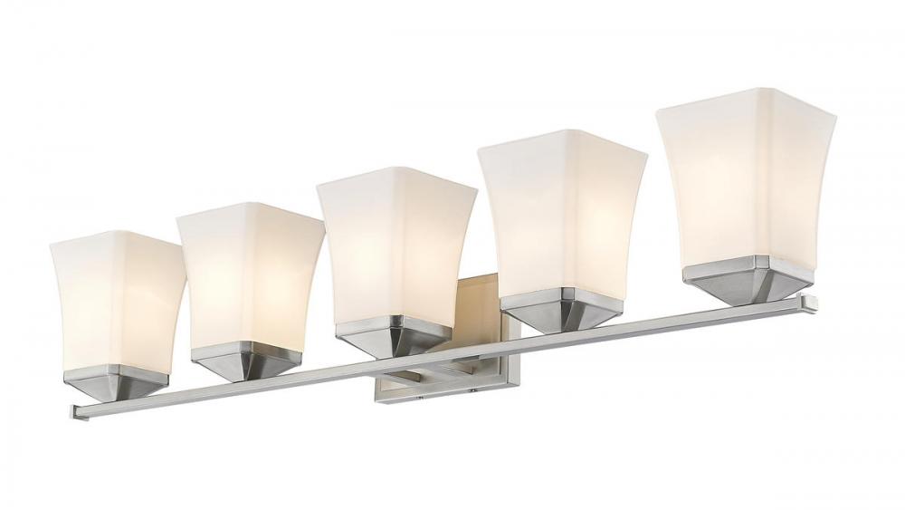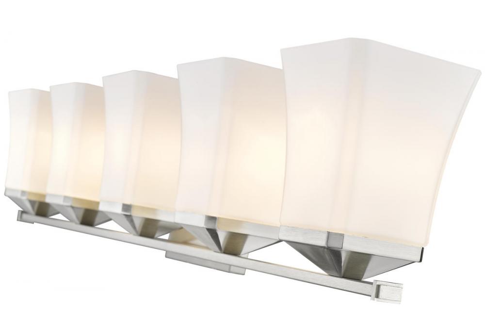 This simple yet stylish five-light vanity fixture is an easy upgrade to your bathroom. Featuring five glass shades in etched opal, a flared silhouette instantly catches the eye along with a brushed nickel finish.