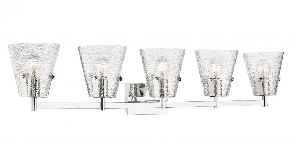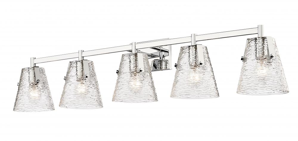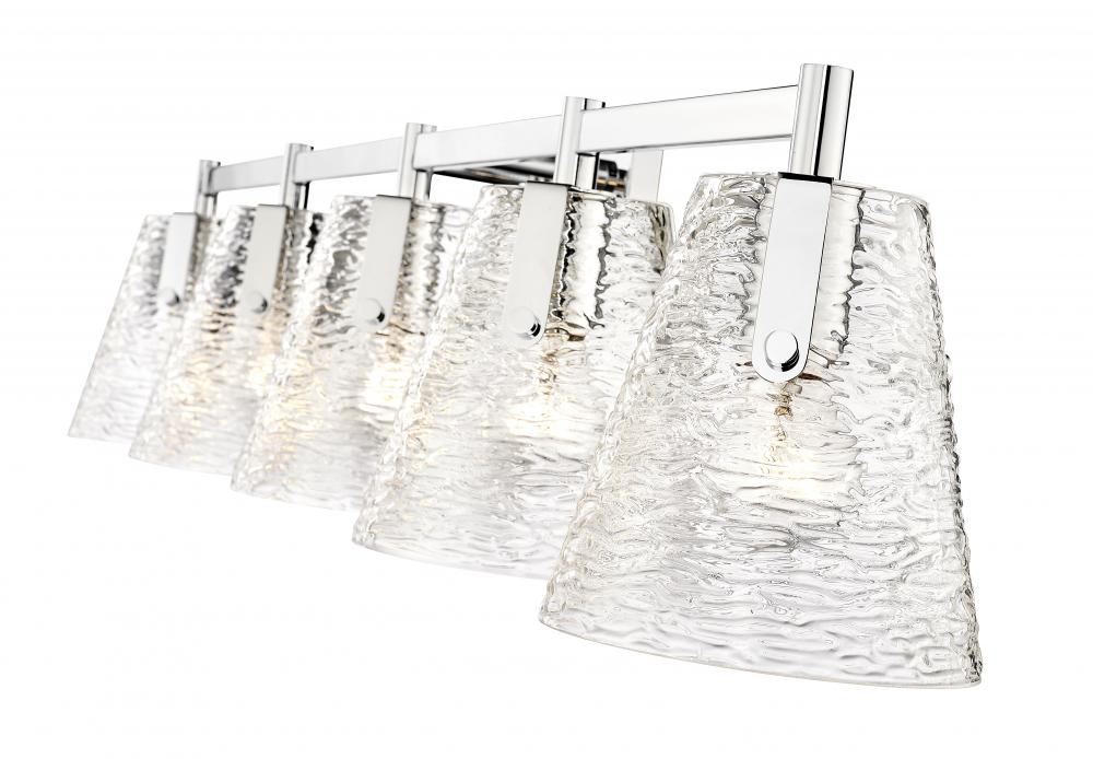 Illuminate and embellish a spacious modern bath vanities with a classic fixture. From the Analia collection, this gorgeous five-light bath vanity light begins a design journey with decadent hand-blown textured clear glass shades in a conical shape. A linear chrome finish steel frame offers a versatile element in a vanity light with both modern and transitional personalities.