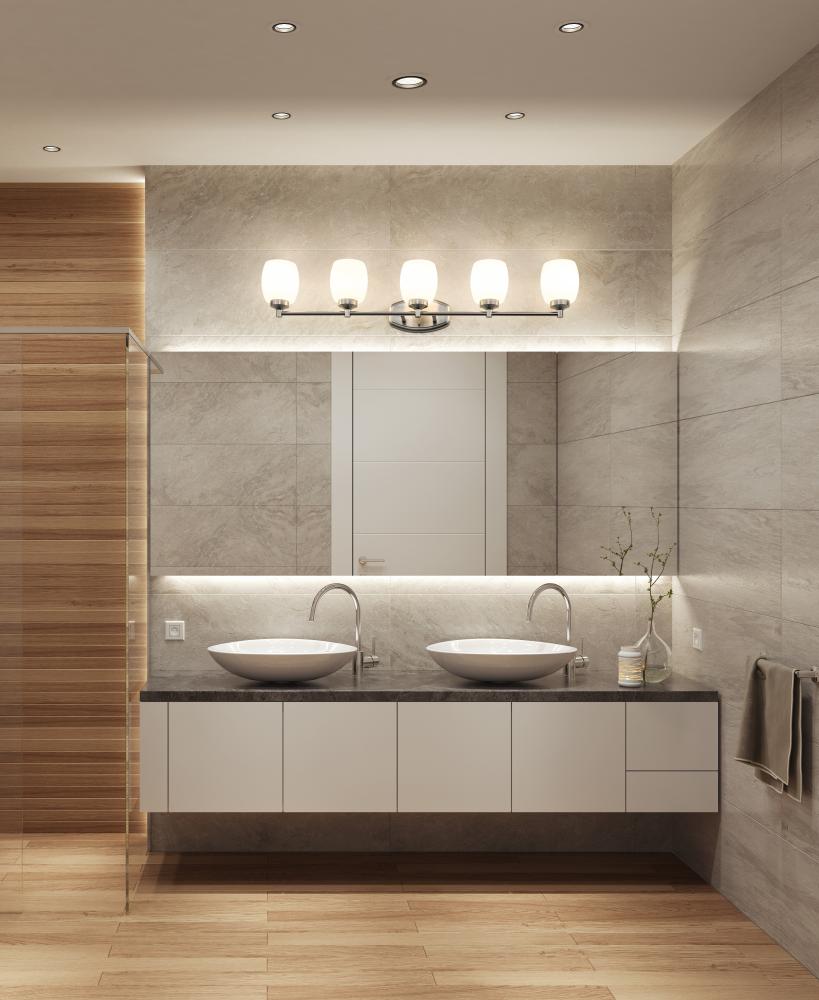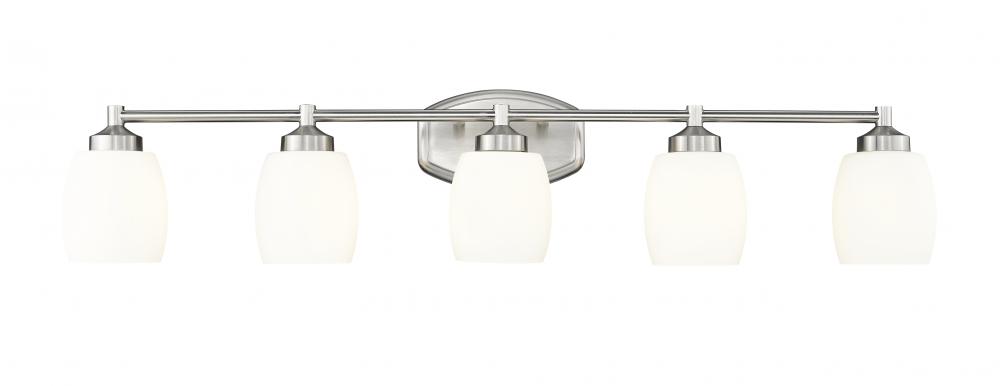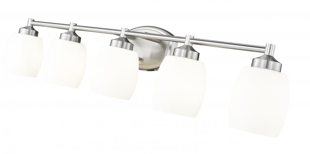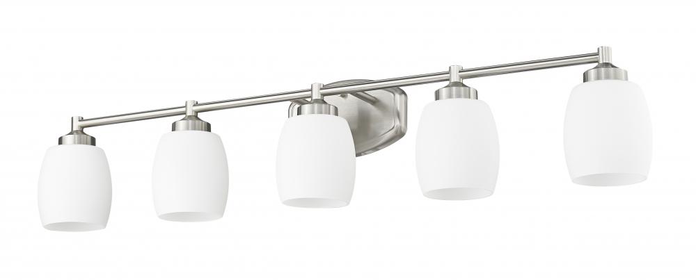The Kendrick collection presents a modern five-light vanity fixture that elevates any bathroom. Its soothing curvature is smooth and clean, complementing a wide variety of decor styles while offering a clean, crisp silhouette in a brushed nickel finish. Five shades feature matte opal glass for diffused illumination, offering a gently rounded profile that creates inviting energy in your bathroom.