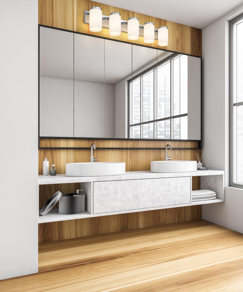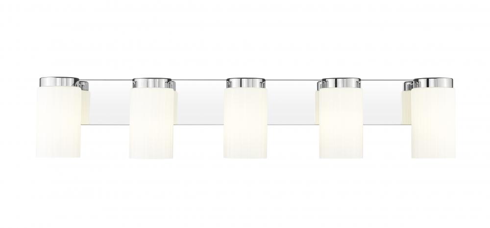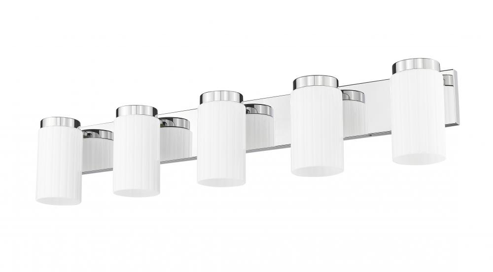 The appealing brightness of a chrome finish creates rich dimensionality for a modern five-light vanity fixture. Cylindrical shades of opal glass feature collar details, creating a sense of depth against a wide wall plate. The clean-lined design is a superb choice for updating a contemporary bath.