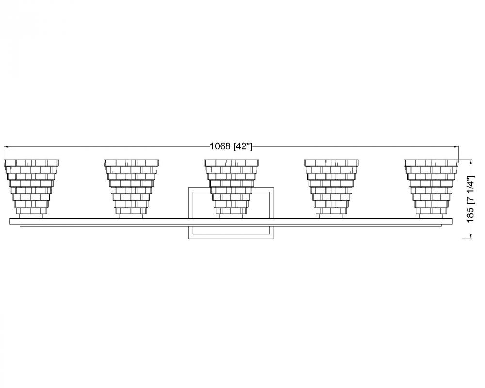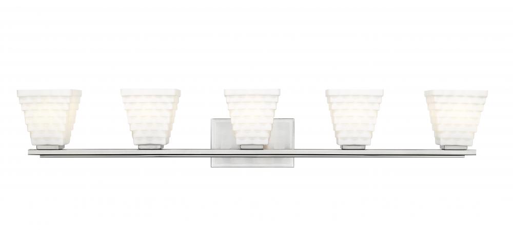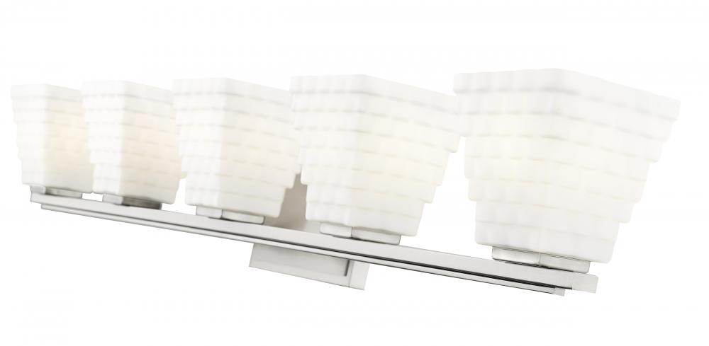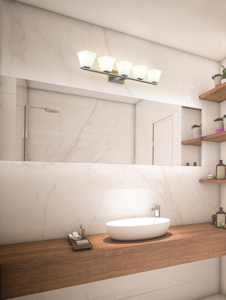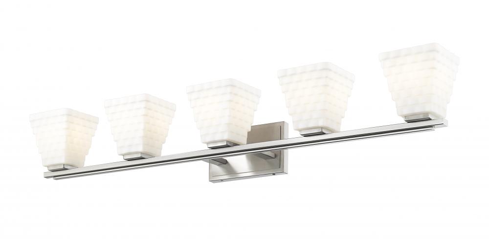 Intricacy infuses every detail of this modern five-light vanity bath light. Featuring a brushed nickel finish backplate and arm, its an artistic presentation of layered details, highlighted with its shades. Each is a tapering square silhouette crafted from stacked opal glass rectangles that create a bold, layered presentation while ensuring bright, diffused illumination.