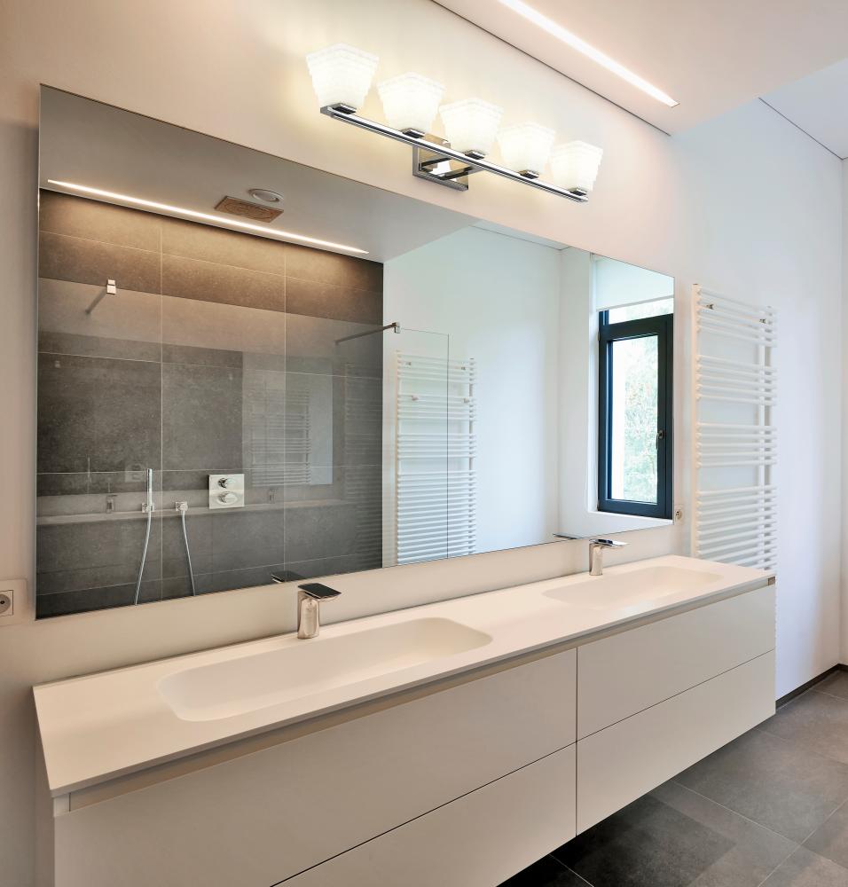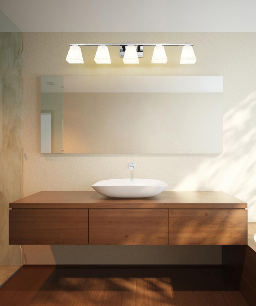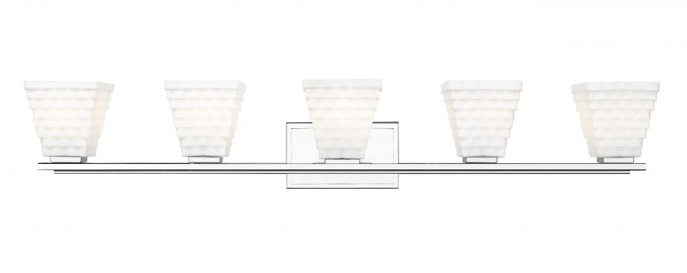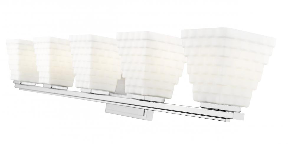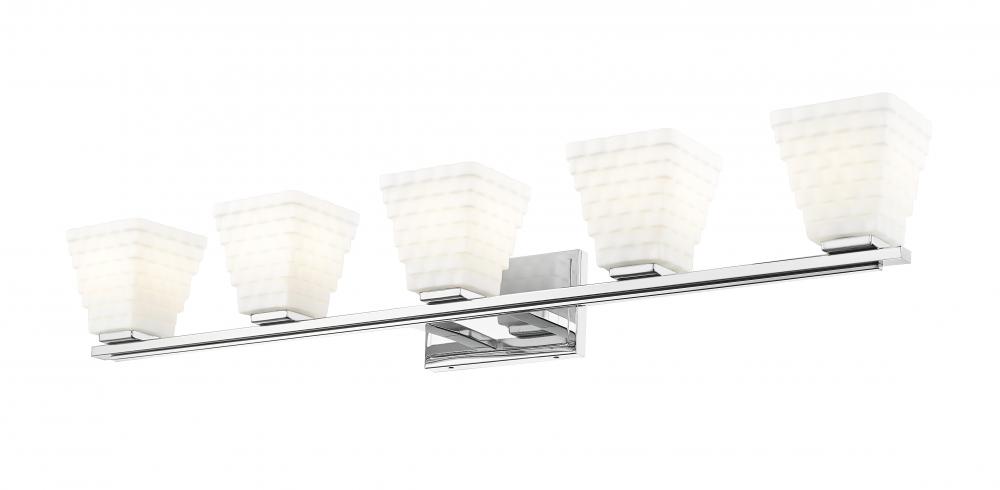 Gleaming chrome infuses contemporary style into this modern five-light vanity bath light. Its layered shade presentation is created with stacked opal glass rectangles, offering artistry and dimensionality in your home. Subtle layered details are present on the metal backplate and arm, adding stylish depth to the overall aesthetics of the fixture.