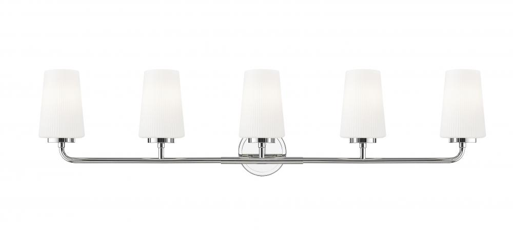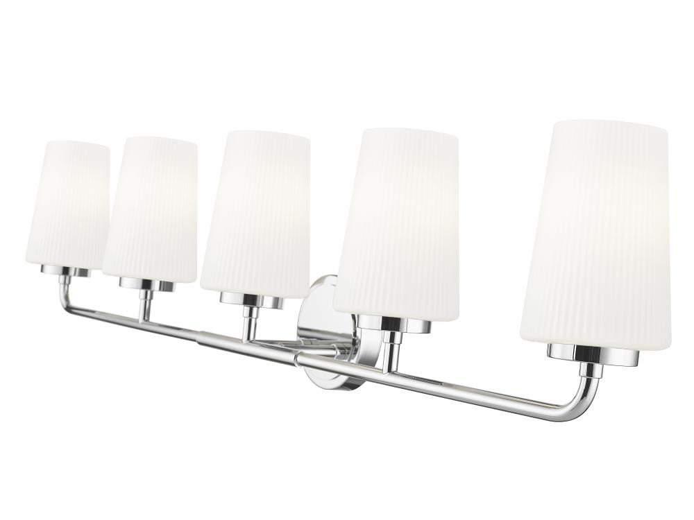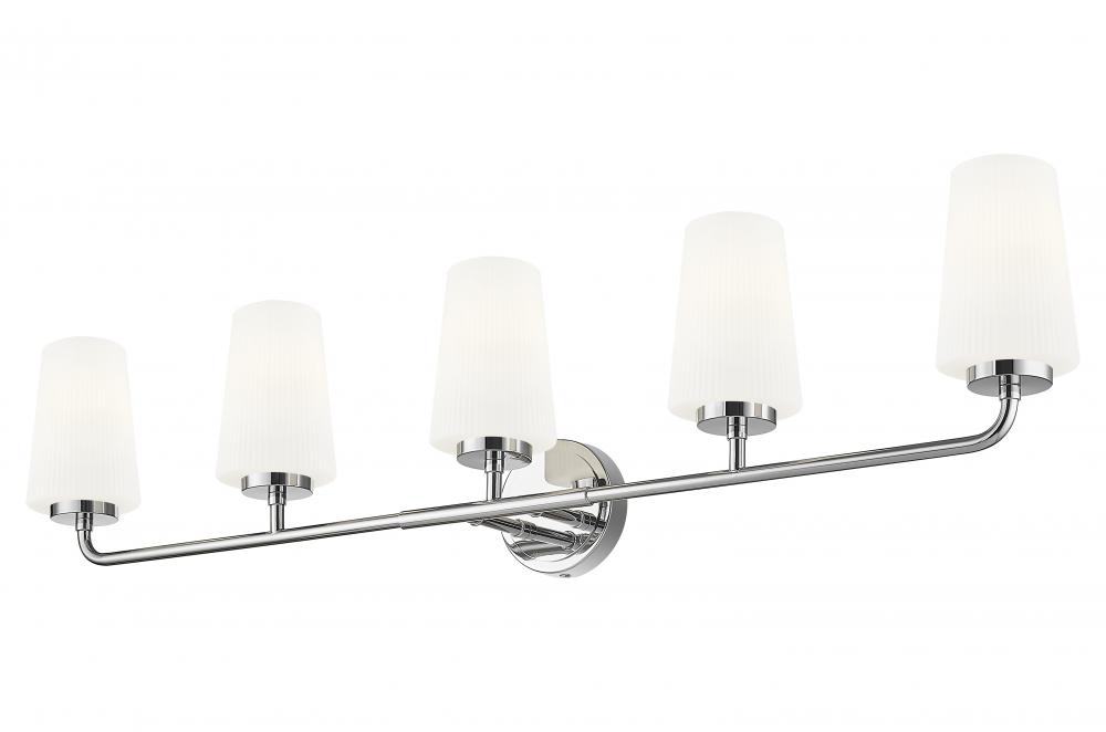 Add sophisticated lighting and style with a modern five-light vanity wall light. Its clean, fresh silhouette is enhanced with a gleaming chrome finish, adding dimension and depth to your decor. Five shades of ribbed opal glass stand tall and diffuse illumination for excellent ambiance in your home.