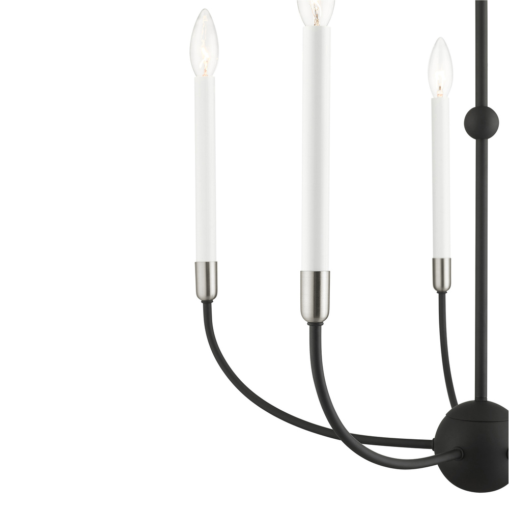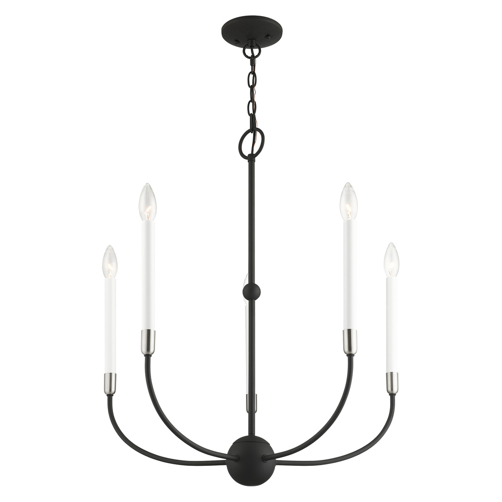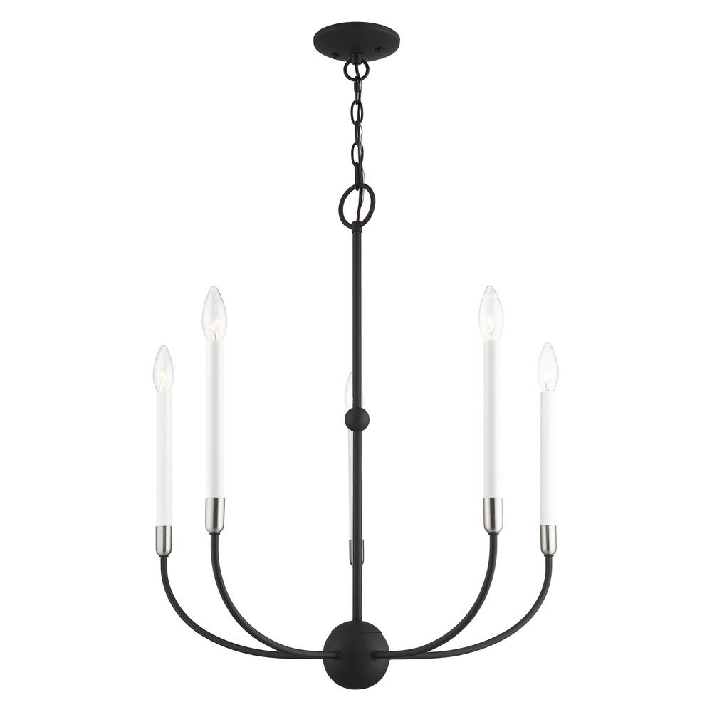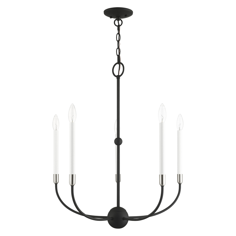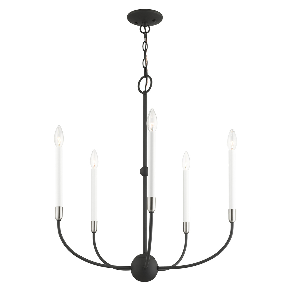 Updated traditional elegance and casual style defines the Lucerne collection. The curvilinear steel frame is offset by a black finish with brushed nickel finish accents. The essence of this collection amplifies today?s approach to a transitional style interior. This five-light chandelier will add a rustic and casual flare to your living room, dining room or kitchen.