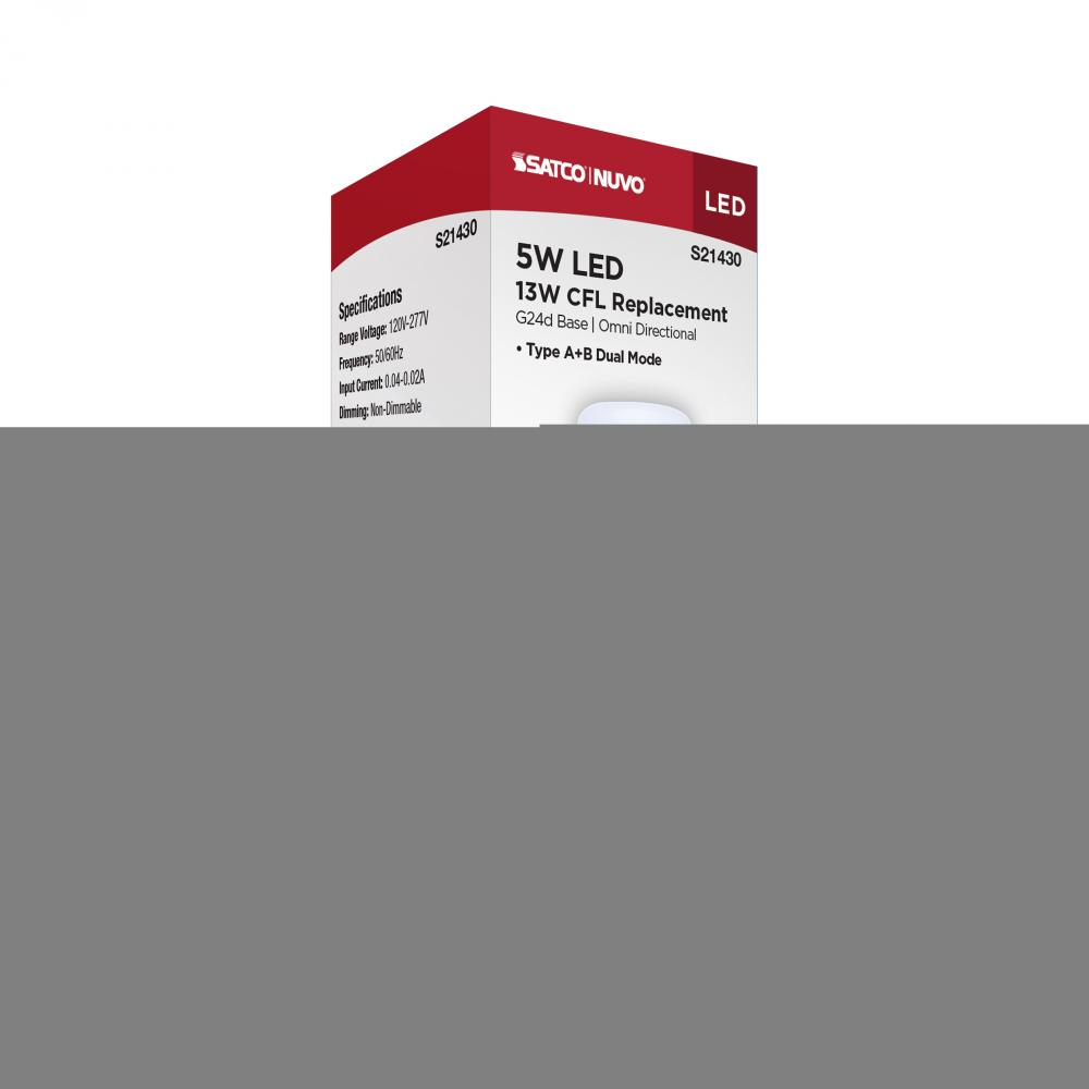 SATCO NUVO's S21430 CFL replacement lamp delivers reliable, energy-efficient performance in a compact and versatile PL shape. This 5-watt model is designed to replace 13-watt CFLs, providing a 2700K warm white light with a G24d base. A+B dual mode ball